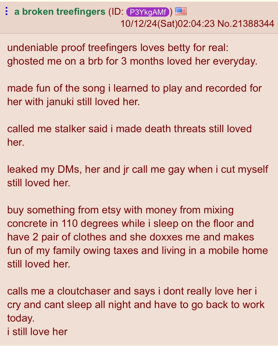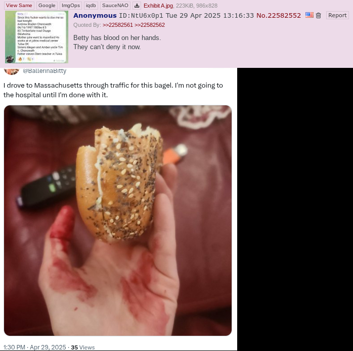 [568 / 70 / 1] 334KiB, 832x979, IMG_0061.png View SameGoogleImgOpsiqdbSauceNAO Thread Reply Original Report Media View Same Google ImgOps iqdb SauceNAO Download /bbg/ Betty Bug General #108 Anonymous ID:gUNSYlNe Fri 02 May 2025 16:03:42 No.22596013 View ViewReplyOriginalReport Quoted By: >>22596038 >>22599775 Betty is UGLY edition>NewsBetty doxxed and harassed dejectual to death