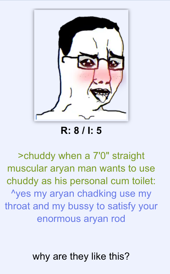 >they say "DOCTOS" to things that are bad>they say "xe" or "xhe" instead of "he" or "she", obviously ironic but it's just not funny>they worship admins from the sharty (embarrassing)>they dont use arrows a lot of the time, only in soidueling >they self insert as the soijak>they post black soijaks/hanging black soijaks (deeply unfunny 13 year old tier humor)>they call for doxes on random peoplethe TL;DR is the people ITT have no interests. they see soijaks not as a mean to make fun of opinions of make funny images about stuff but as reaction images, self inserts and occasionally to quote someone who calls them an underaged faggot (which they probably are)