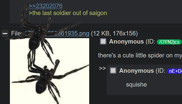 [18 / 6 / 1] 12KiB, 176x156, 1756493802861935.png View SameGoogleImgOpsiqdbSauceNAO Thread Reply Original Report Media View Same Google ImgOps iqdb SauceNAO Download Anonymous ID:/OYN2jcs Sat 30 Aug 2025 02:34:07 No.23202056 View ViewReplyOriginalReport Quoted By: >>23202087 >>23204953 >>23204978 >>23205740 there's a cute little spider on my screen. I think he might be a newcastle big boy.