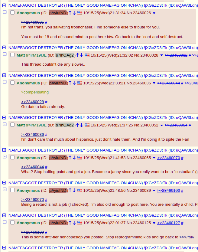 NAMEFAGGOT DESTROYER (THE ONLY GOOD NAMEFAG ON 4CHAN) !jXGeZD3tTk ID:uQAW3Ldn Thu 16 Oct 2025 04:47:46 No. 23460809 Report Quoted By: