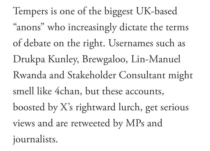 >>23461889 >Tempers is one of the biggest UK-based “anons” who increasingly dictate the terms of debate on the right. >anons >literally namefag on Xitter (because you cannot not namefag on Xitter) ...