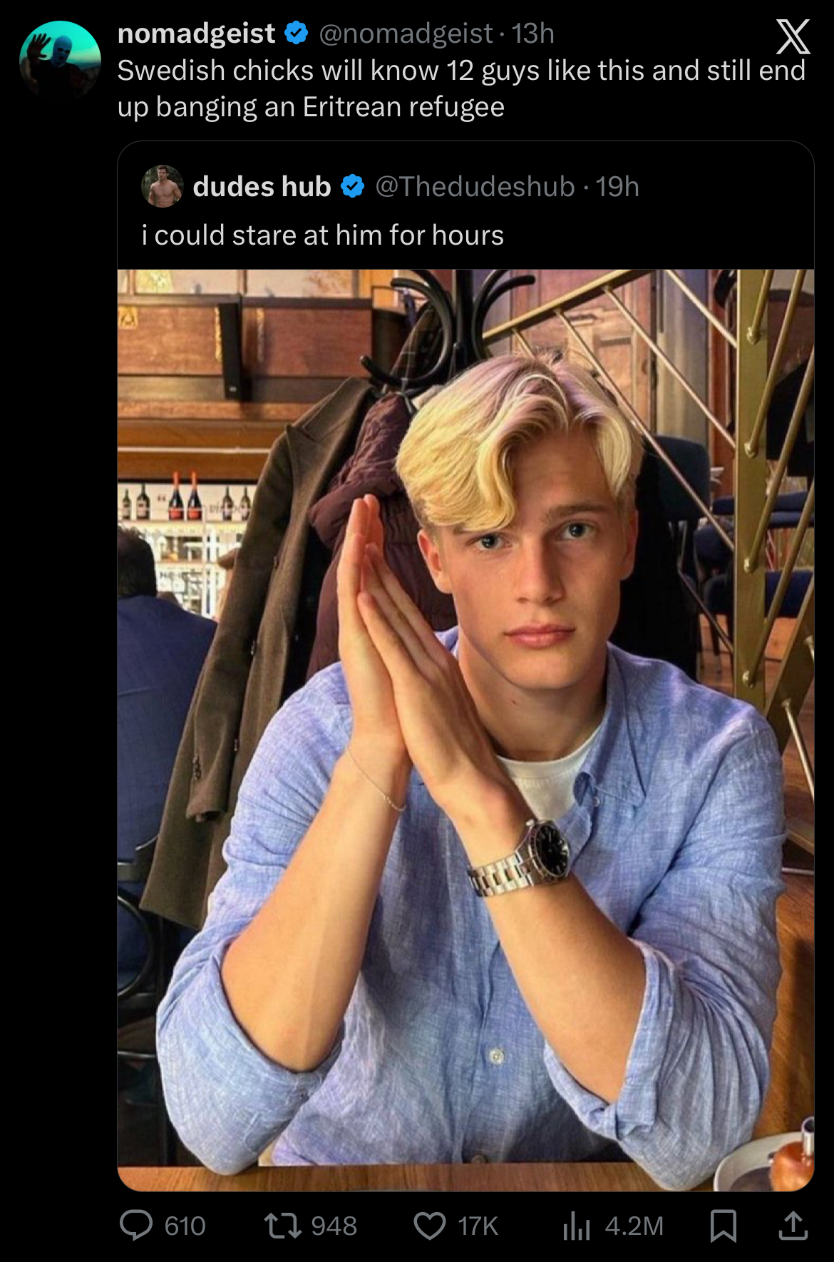 >>23689173https://www.bronzeagepervert.yoga/p/race-in-america-and-the-dork-right"On one hand as within the professional and intellectual social class their competitors for mates would primarily be white men, who will generally outclass them physically and in terms of charisma, they are in many cases driven to greatly exaggerate the sexual and physical prowess of black men—who are often safely at a distance—as a kind of “gotcha” against white men…thus hapas, and Chinese and Indian men continue now on internet boards, along with transsexuals, the old Jewish lionization of black men as a cultural-sexual image against the resented white or more specifically WASP “lacrosse frat boy” who is the nerd’s actual or perceived competitor or bully. In the case of “professional” males from darker-skinned Asian and other races, there’s also sometimes an amusing attempt to extend the sociosexual allure that black males enjoy in current day American society to themselves as supposedly virile or attractive to women merely because of their skin tone"