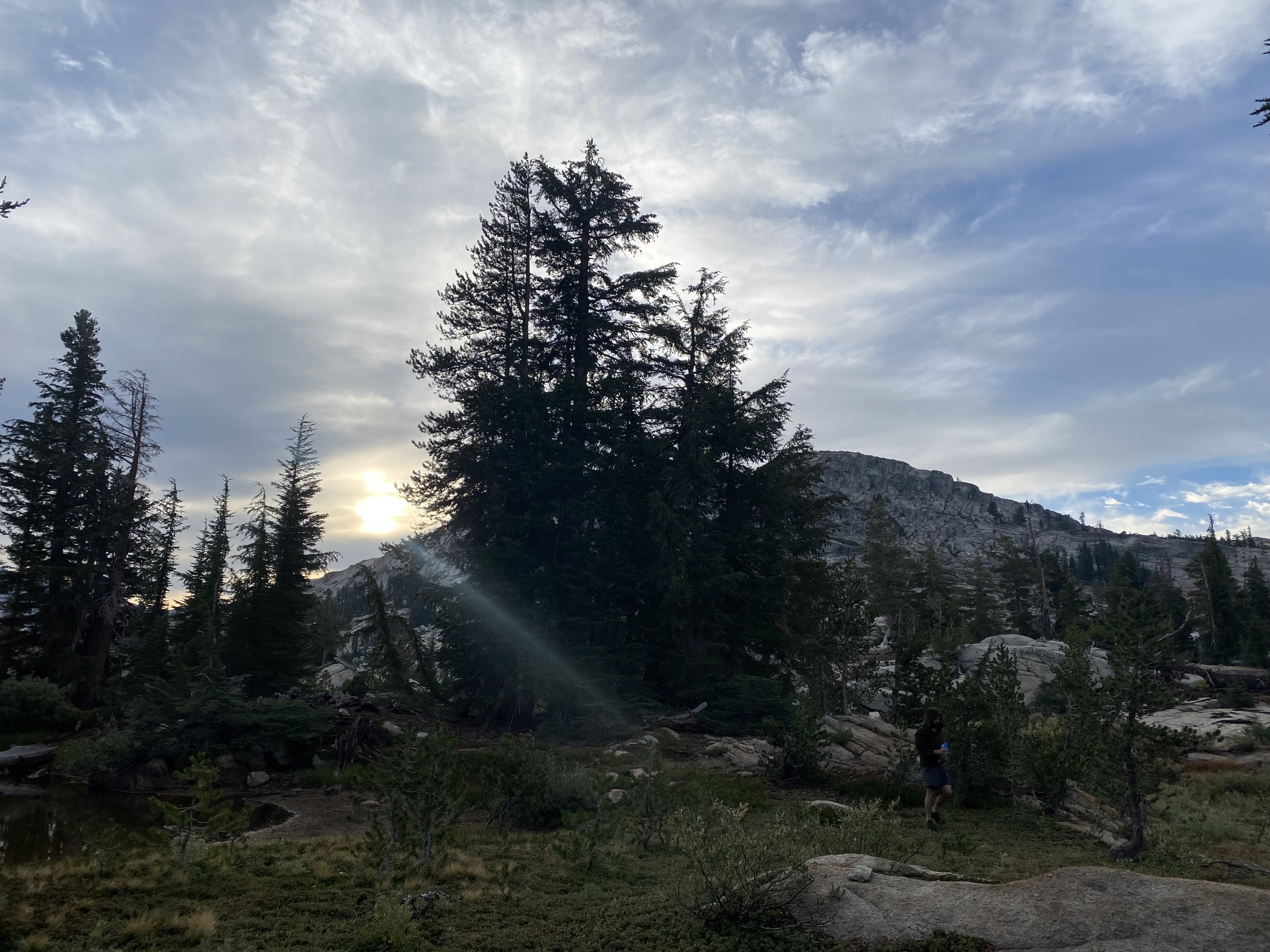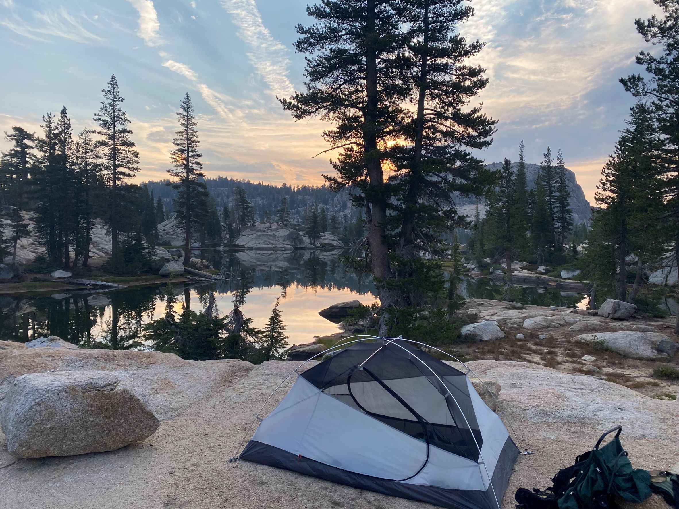 We started at Crabtree Trailhead with a goal of making camp at Chewing Gum Lake. Due to traffic we arrived an hour before sunset and had to hike in with headlamps. We were lucky enough to have a full moon that night and due to some smoke, it was a brilliant orange color. Very spooky atmosphere cresting the pass to see a valley below you with the moon and wispy clouds guiding your way. Finally made camp around 2200. It was a remarkably still evening so the lake reflection was incredible (picrel is first nights camp).