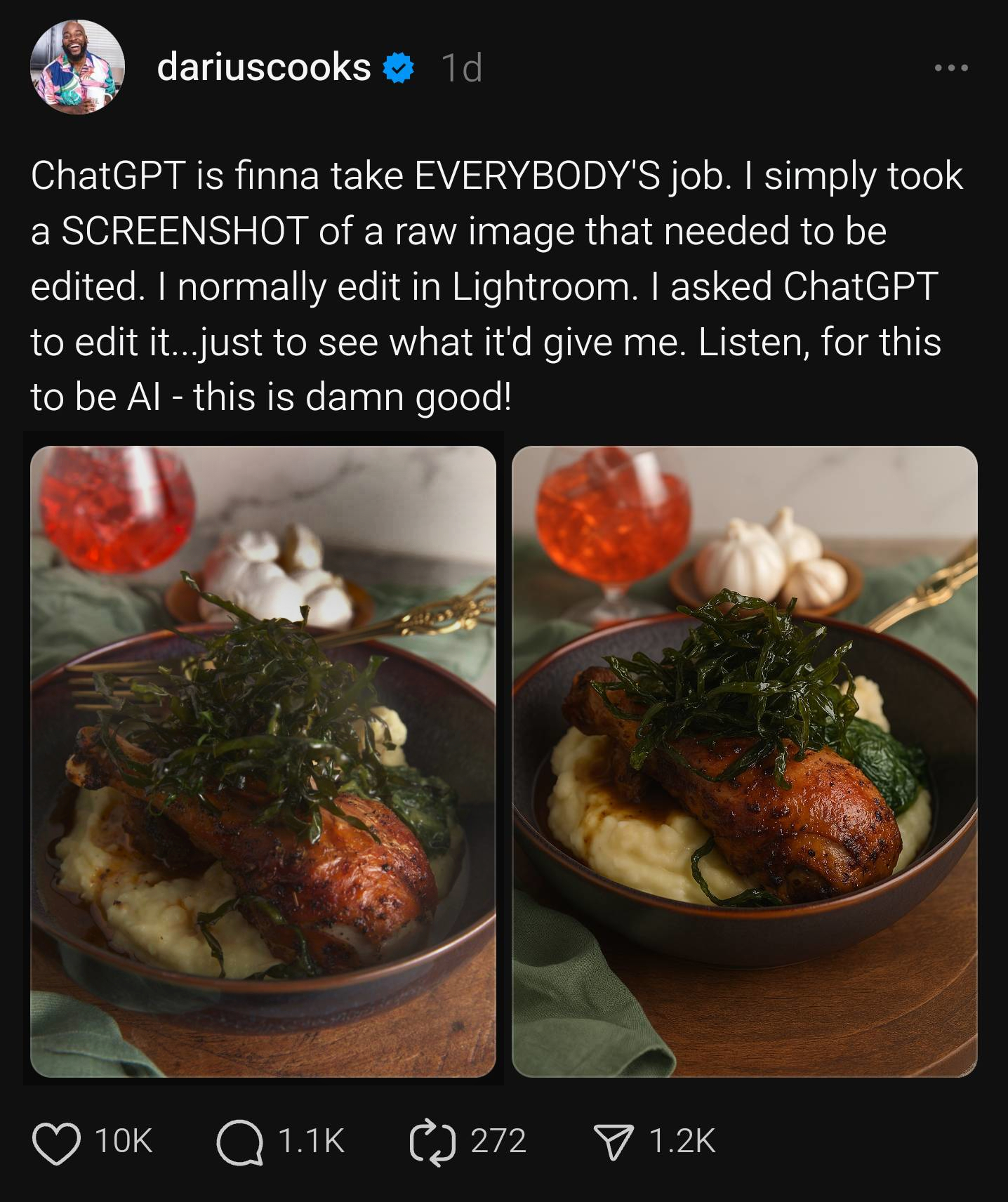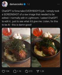 >pick up on the subtleties>must be able to see>know it's a fork>have an idea>yet it decidedAll the individual pixels (or, sometimes they are grouped up in to blocks) influence all of the other ones at the same time, but not in a strict categorical or traditionally algorithmic way. That's why it doesn't "know" where to put the fork, because it doesn't "know" anything in that rigid way that we're thinking, and the strengths assigned to each possible influence during its training weren't right to turn that input in to the pixels that appear to us as a correctly placed fork. I don't say this to devalue the output, just to explain how it works.