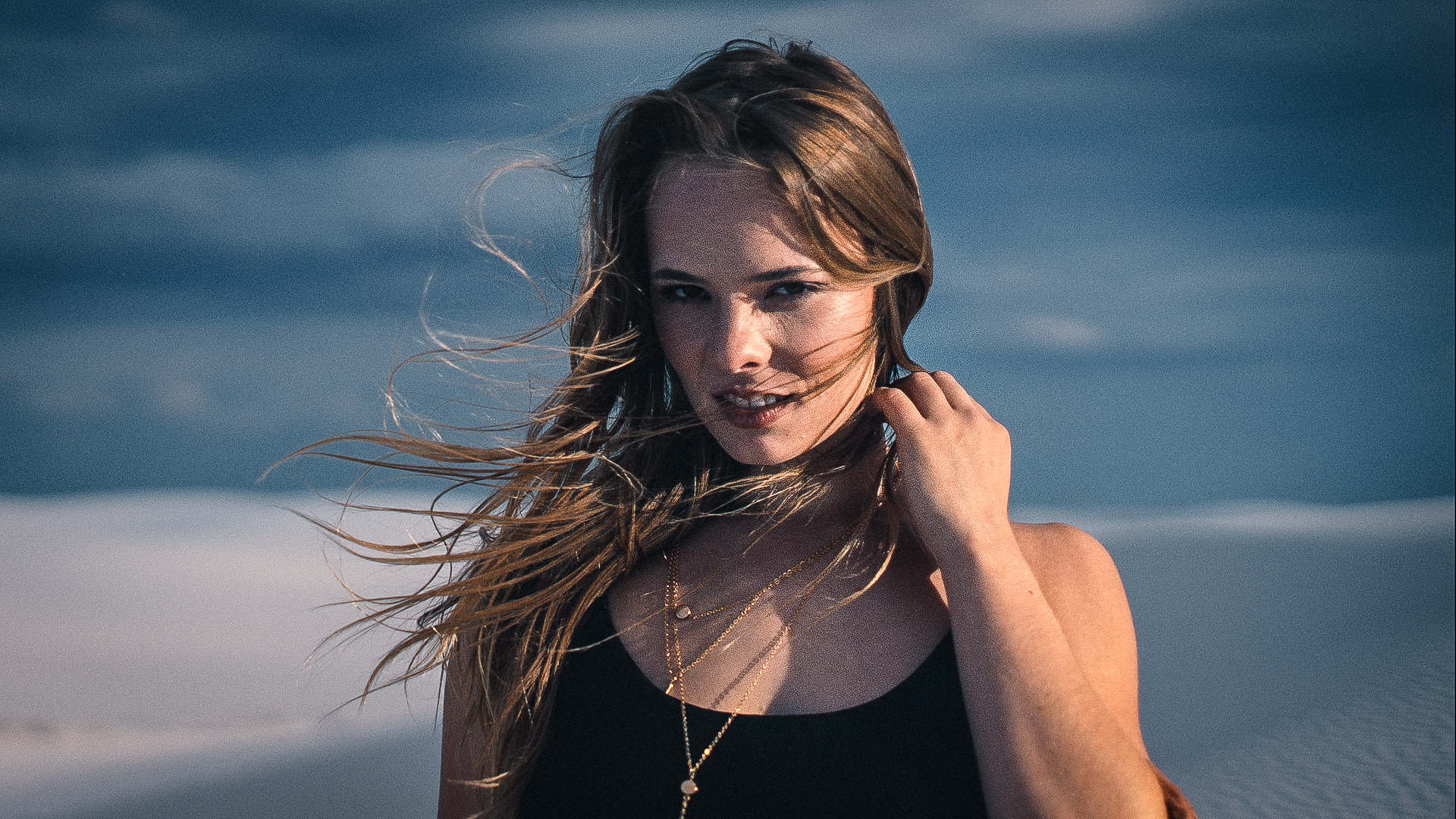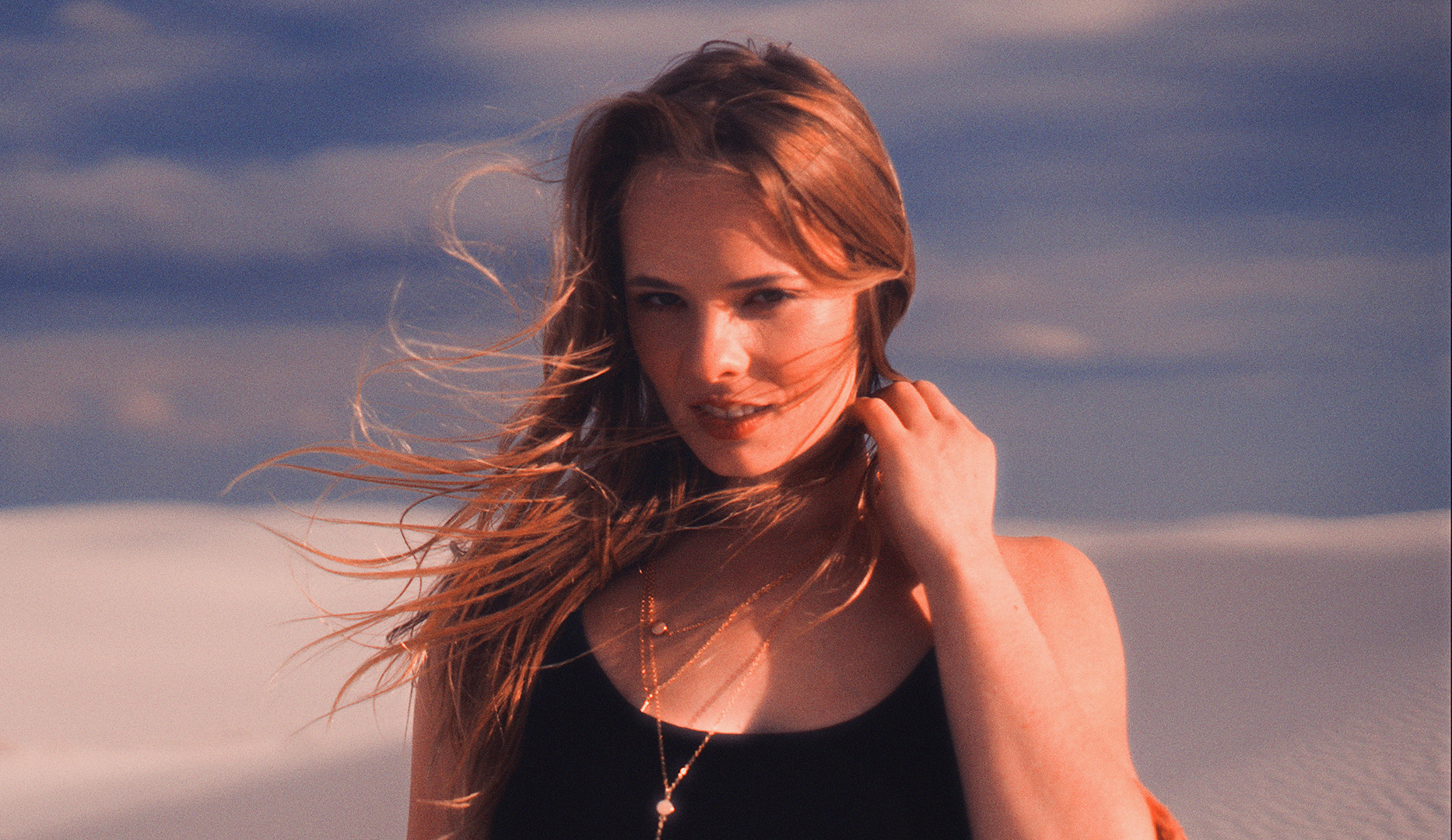 this image takes me back with so many problems, hair blowing over the mouth which you had to photoshop out, having to try and naturally brighten the teeth, Models squinting from that really low bright sun, the clouds suggest maybe one of those days the sun only breaks through clouds every now and then, really difficult to shoot in that.