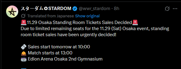 >Yuki Mashiro (Freelance) vs Ranna Yagami (STARDOM/God's Eye)>Rest of card: https://gokigenpro.com/news/2025/10/24/1697/November 22nd, [Sendai Girls Pro Wrestling] "Mika Iwata 10th Anniversary『Kick Thunder Claw Marks』, Nishitetsu Hall, Fukuoka, 2:00PM JST (LIVE)