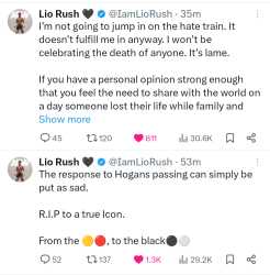 >>18476406>All the black people in wrestling who said something positive about Hogan on social media after his death took a risk by just doing thatLio Rush is a good example of this