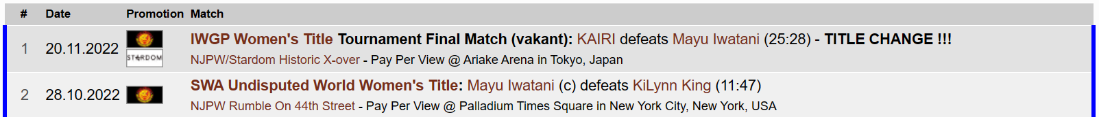 Kairi and Saori Anou vs Unagi Sayaka and X at the AJPW event, September 8th. Possibly Kairi's final match in Japan.