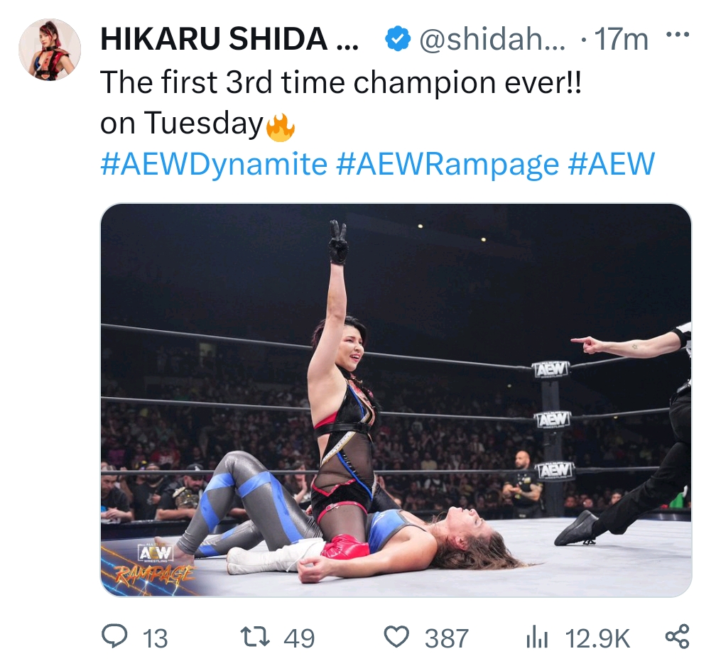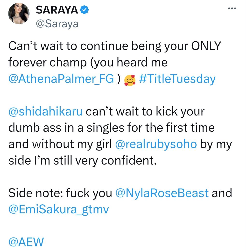 >Before their match on 'Title Tuesday', Hikaru Shida has told AEW Champion Saraya that a message was sent during her tag match win on Rampage, adding "See you on Tuesday bitch".