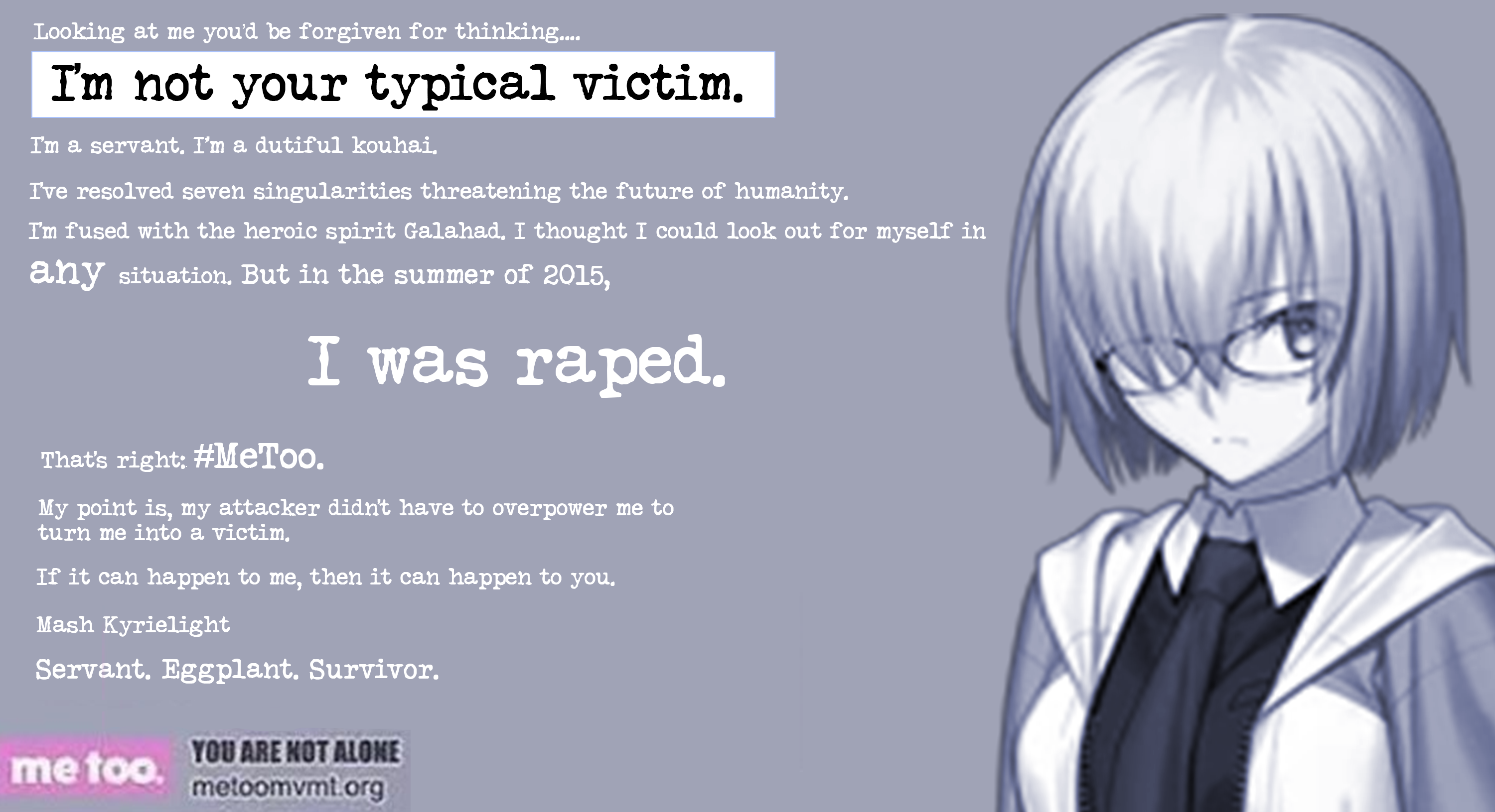 Now last week, I was watching TV, and I watched a 17 year old girl come out here, who's wearing a pair of Depends, come out here and say she's still the heroine. I see Tohsaka Rin; 'Number Two, the tsundere magus' come out here who's been the butt-end of all the jokes, cos she's supposed to be the 'gandr shootin', gem flingin', number one Master' but I'm saying one time, you should've took a cab and used that money to fix your rhino horn of a nose! So I had to ask myself 'If Fate was going to hire a tsundere magus, number 2, why won't they hire "The Magic Gunner", the original tsundere magus, Aoko Aozaki?' Now I know that Mahoyo is dead, God rest its soul, but Tohsaka Rin, your career is dead. And I know, as her series lays six feet under, Aoko's still stylin' and profiln' because when you used your little brain, and stole her gimmick, there's one thing you couldn't steal, and that was her class! So when you walked down that aisle last week, I know I wasn't alone, cos the people at home, all they did was grab the remote, change the channel to Prisma Illya, and watch Illyasviel; a person you and your friends got fired from here and kept her from gettin a route, cos you're a jealous, little skank! So Tohsaka Rin, remember this: In this chuunige business, there's never been a bigger pants pissin', cock-suckin' whore in this business - but also in life you're the biggest pants-pissin', back-stabbin', cock-suckin' whore. And you belong where you're at: In Fate, because Fate sucks!