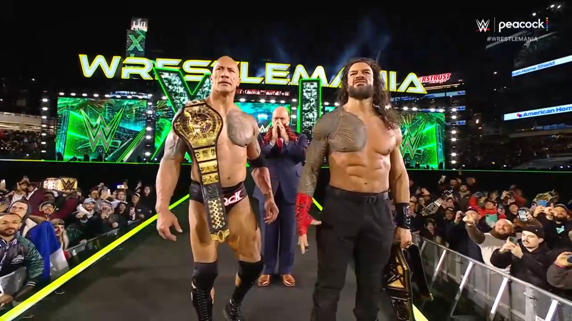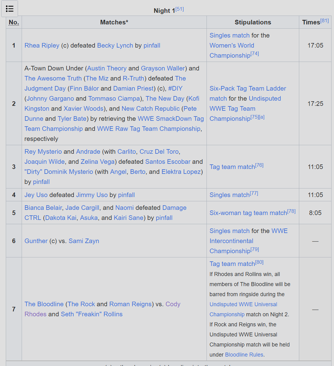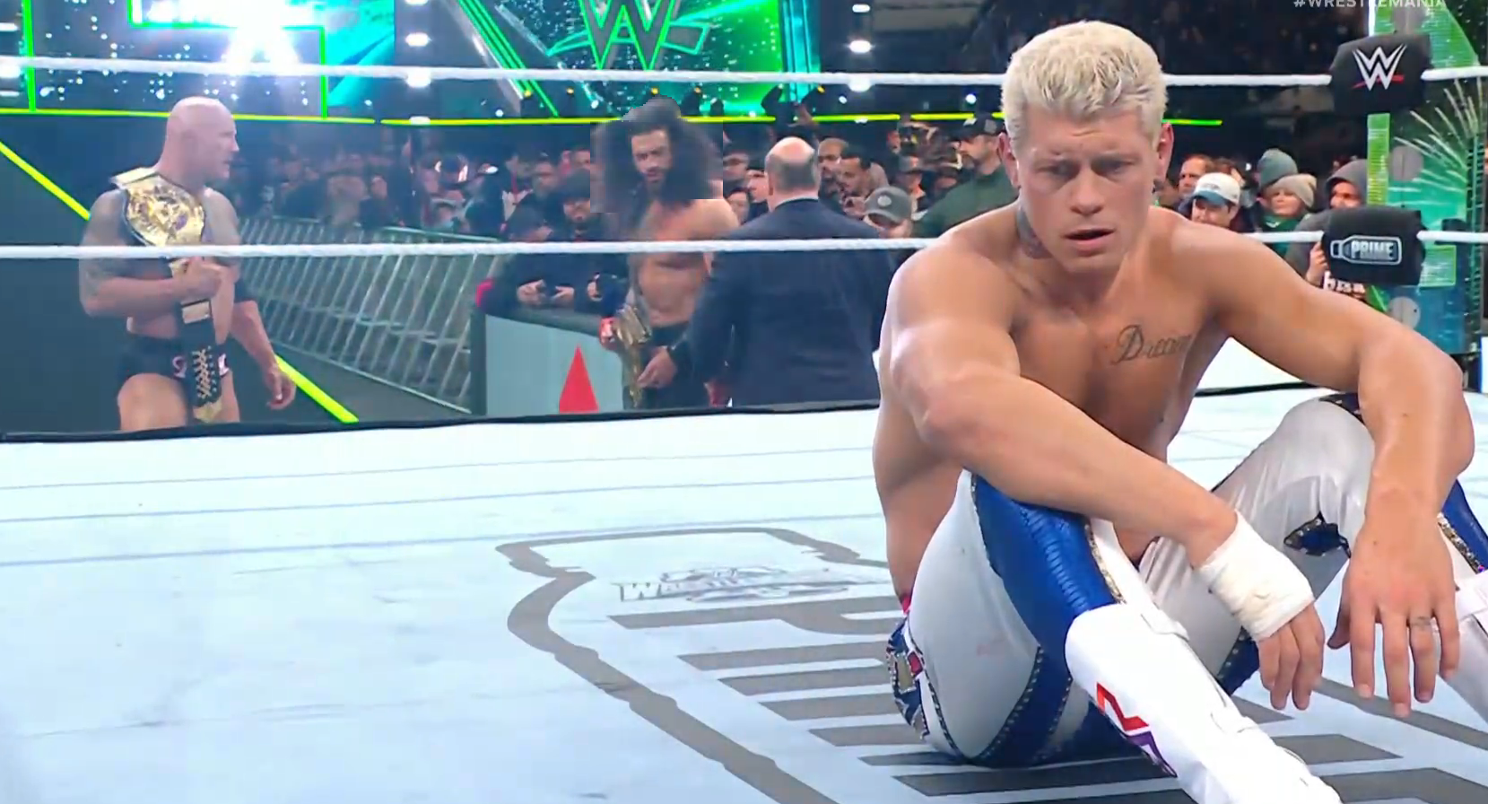>The Rock/Roman Reigns vs Seth Rollins/Cody Rhodes; winner decides the rules for Night 2's main event