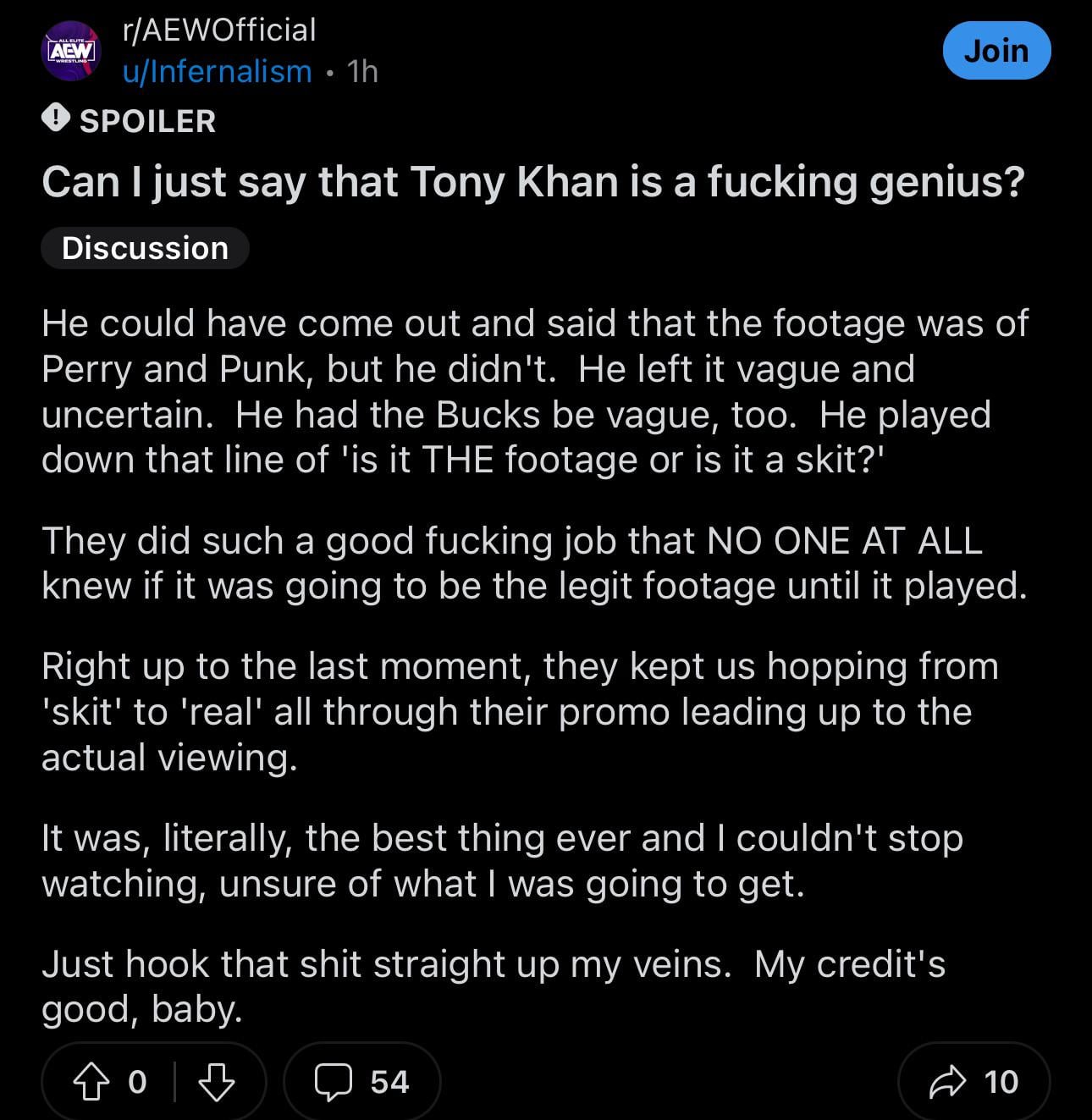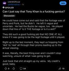 [19 / 4 / 1] 191KiB, 1290x1323, 1705618771062097.jpg View SameGoogleImgOpsiqdbSauceNAO Thread Reply Original Report Media View Same Google ImgOps iqdb SauceNAO Download Anonymous Thu 11 Apr 2024 06:47:21 No.14199892 View ViewReplyOriginalReport Quoted By: >>14199923 >>14199930 >>14199987 >>14200193 >>14200297 >>14200301 >>14200305 Tony Khan is a GENIUS