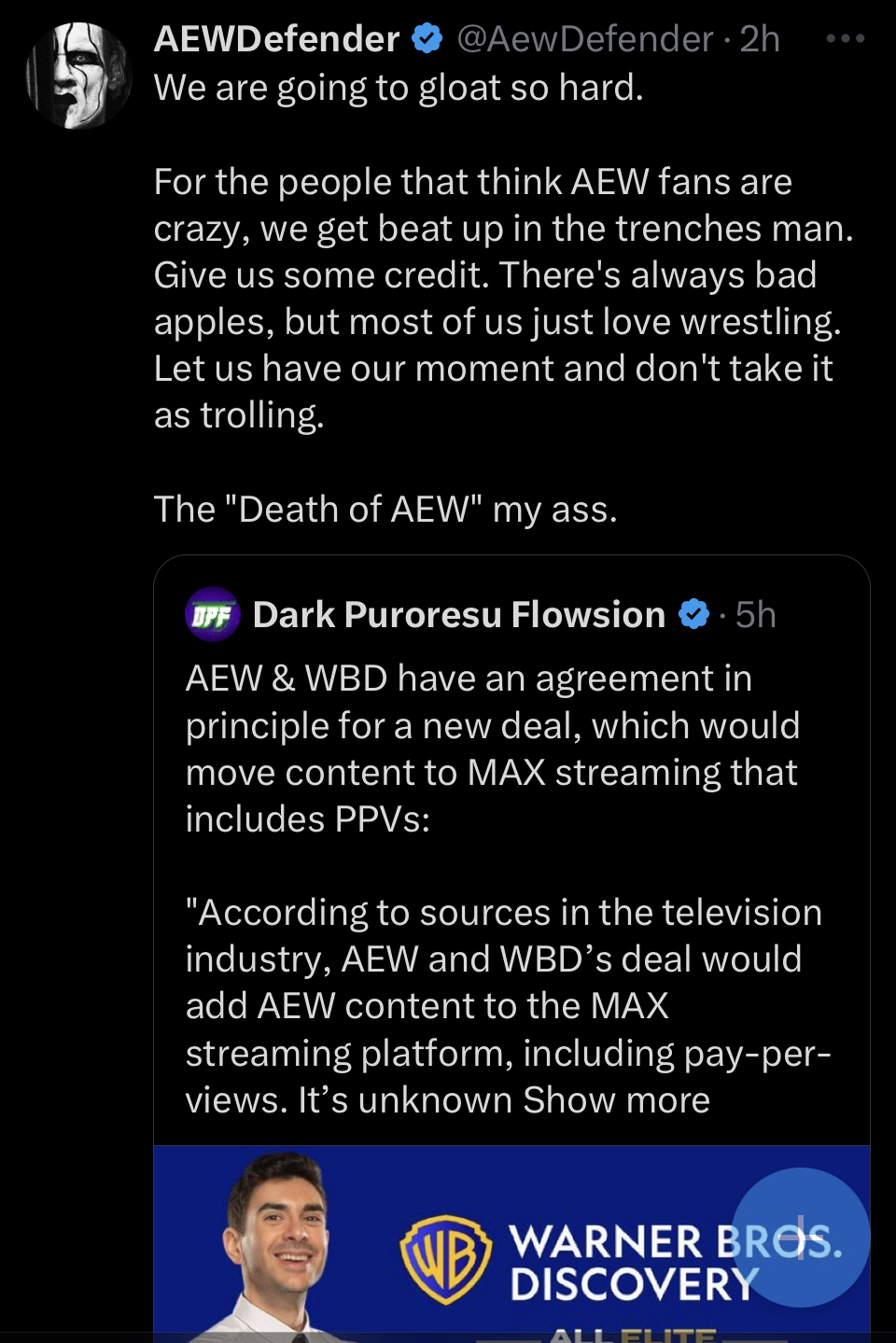>>15312496So this guy in the OP sounds like a complete retard but aewtists as a whole will definitely have a shit ton of room to push this back in edrones faces once it happens and they're the ones who created all of that room with every post and thread about AEW getting canceled and not renewed. I don't have a dog in this fight so I just get to sit back and laugh at it all but edrones 100% have it coming