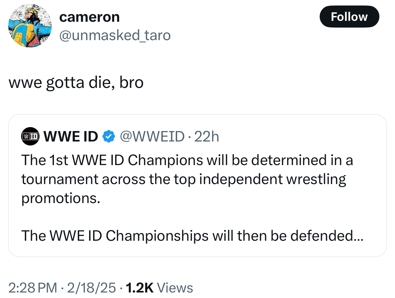 [25 / 3 / 1] 372KiB, 1290x973, IMG_2767.jpg View SameGoogleImgOpsiqdbSauceNAO Thread Reply Original Report Media View Same Google ImgOps iqdb SauceNAO Download Anonymous Wed 19 Feb 2025 21:06:22 No.17056691 View ViewReplyOriginalReport Quoted By: >>17056710 >>17056721 >>17056728 >>17056749 >>17058186 >>17058287 >>17060195 >>17060246 >>17061790 >>17061811 Have AEW fans gotten more unhinged lately?