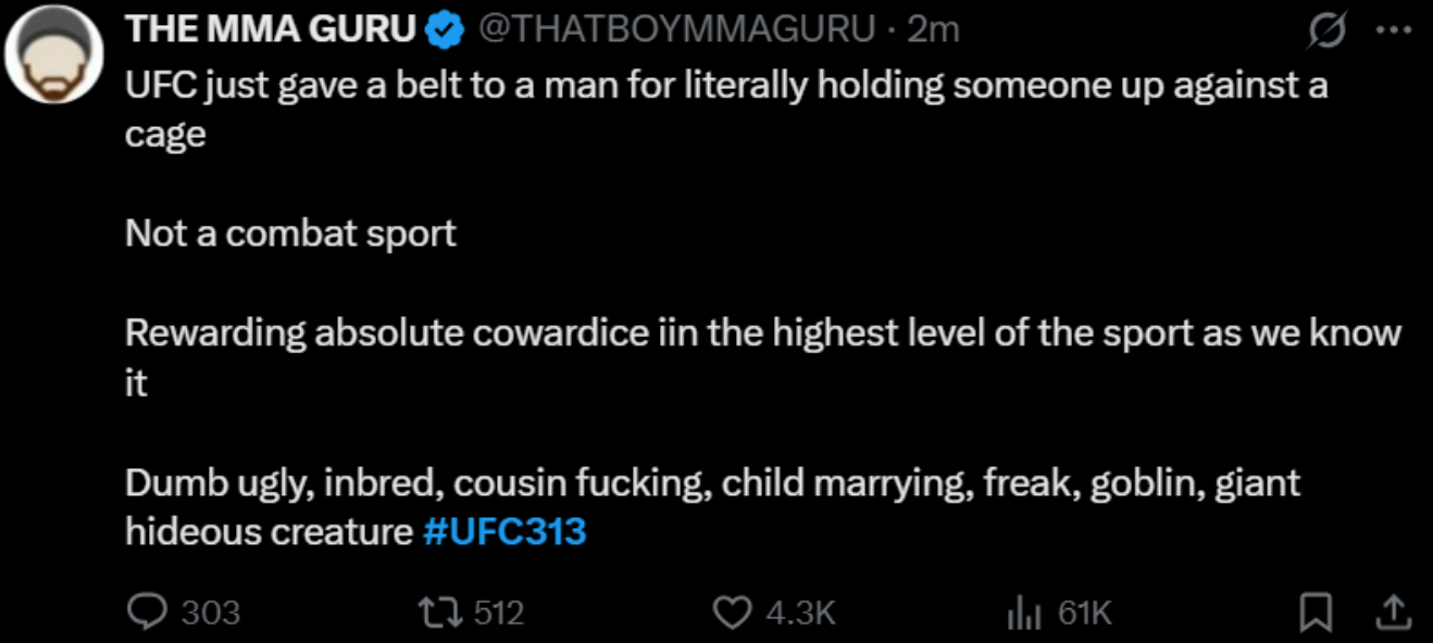 [12 / 2 / 1] 145KiB, 1318x592, 1741500576189152.png View SameGoogleImgOpsiqdbSauceNAO Thread Reply Original Report Media View Same Google ImgOps iqdb SauceNAO Download Promo's good Anonymous Sun 09 Mar 2025 06:31:08 No.17208657 View ViewReplyOriginalReport Quoted By: >>17208671 >>17208693 >>17208706 >>17208808 TKO is wrestling because they own WWE. But they also own UFC so UFC is WWE related.