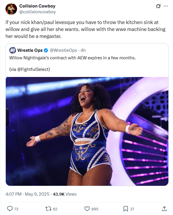 >If I’m HHH I would tell TKO to give her whatever she wants money wise. She’s built to be a perfect face of the company right next to Cody ... If I’m TK I’m giving her more money but also guaranteeing her a world title run within the next couple months>Willow has more potential in WWE than mariah, she could easily get on that Becky and Rhea level stardom>I don’t think Tony fumbles this, but she screams underdog babyface that WWE fans would be behind every single day of the week. ... TK has to re-sign and give her that monster push>I don’t think this TKO machine would get her. Even though I agree she has top star potential>belair level of popularity in 6-8 months max>Willow is a no brainer. Willow with an actual machine behind her is a license to print money.>She would be Rhea/Bianca levels of popular in months, the NXT crowd would have be in her palms in minutesthere are definitely seriously talents in AEW but "fat black woman baseddettors gas up for being fat and black" i did not think was gonna be one of them.
