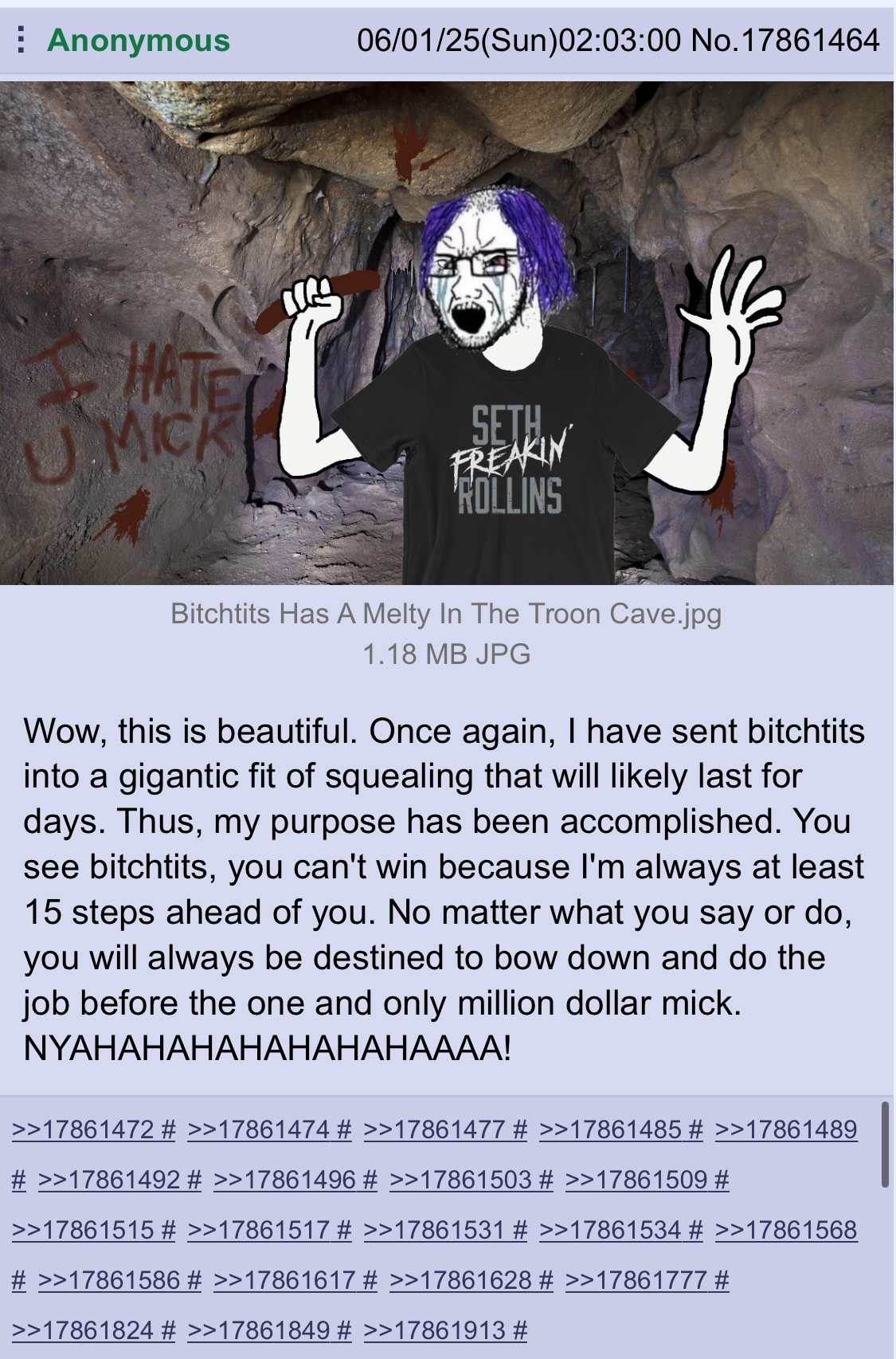 Rovert, a passionate fan of AEW, finds himself in a fierce rivalry with his nemesis, Bitchtits, an ardent supporter of WWE. Their battles are not just confined to the wrestling ring; they often spill into heated debates about their favorite promotions, with Rovert defending the innovative storytelling of AEW against Bitchtits' unwavering loyalty to WWE's legacy. The rivalry takes a bizarre turn when discussions about gynecomastia arise, as Bitchtits, who has struggled with the condition, often uses it as a point of mockery. In a surreal twist, the two engage in a contest involving black goo, a mysterious substance that symbolizes their animosity, while they navigate through Indian and grain silos, which serve as the backdrop for their confrontations. This unusual setting amplifies the absurdity of their feud, blending elements of wrestling fandom with unexpected challenges, ultimately highlighting the lengths to which they will go to assert their dominance in the world of professional wrestling.