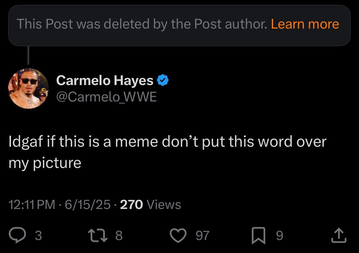 [102 / 23 / ?] 72KiB, 1179x833, IMG_3759.jpg View SameGoogleImgOpsiqdbSauceNAO Thread Reply Original Report Media View Same Google ImgOps iqdb SauceNAO Download [RACIST NEWS] WWE’s carmelo hayes worked by racist westlevotes meme on twitter Anonymous Sun 15 Jun 2025 17:59:07 No.18006811 View ViewReplyOriginalReport Quoted By: >>18006823 >>18006834 >>18007012 >>18007091 >>18007241 >>18008915 >>18009933 >>18011513 the word wasn’t “him” folks