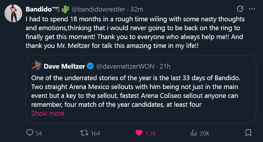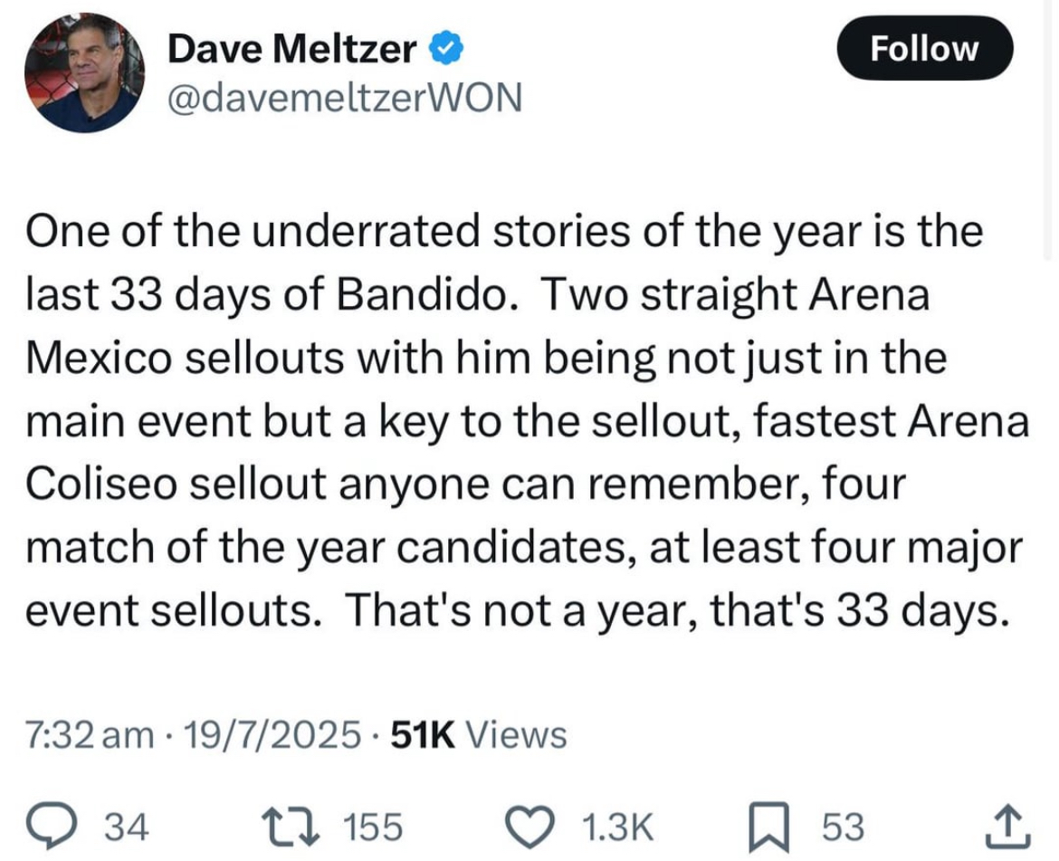 Bandido is the top drawing wrestler on the planet right now. Multiple sell outs attributed specifically to him not to a brand.