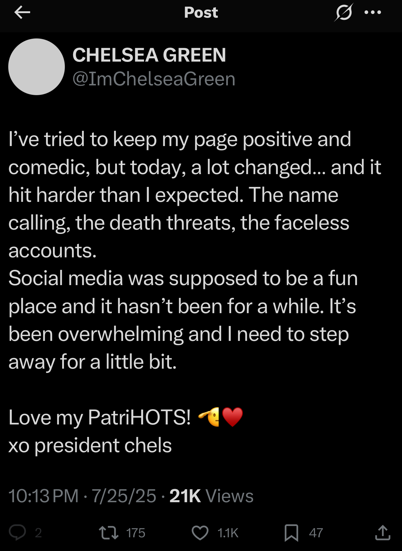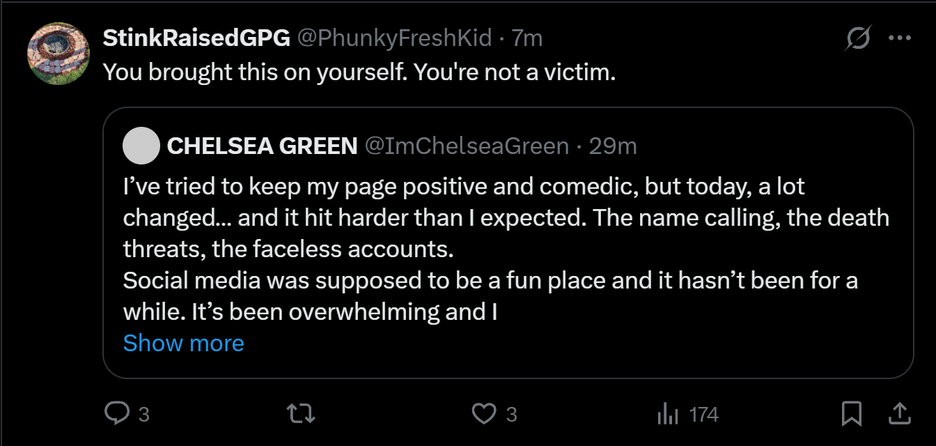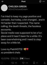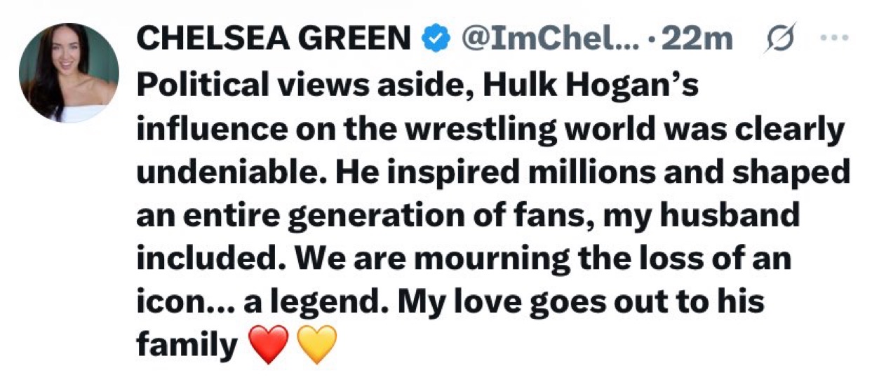 Retards on both ends of the political spectrum have driven the fun loving, happy go lucky Chelsea Green off of Twitter with their deranged and unhinged responses to her innocuous statements regarding the late Hulk Hogan.