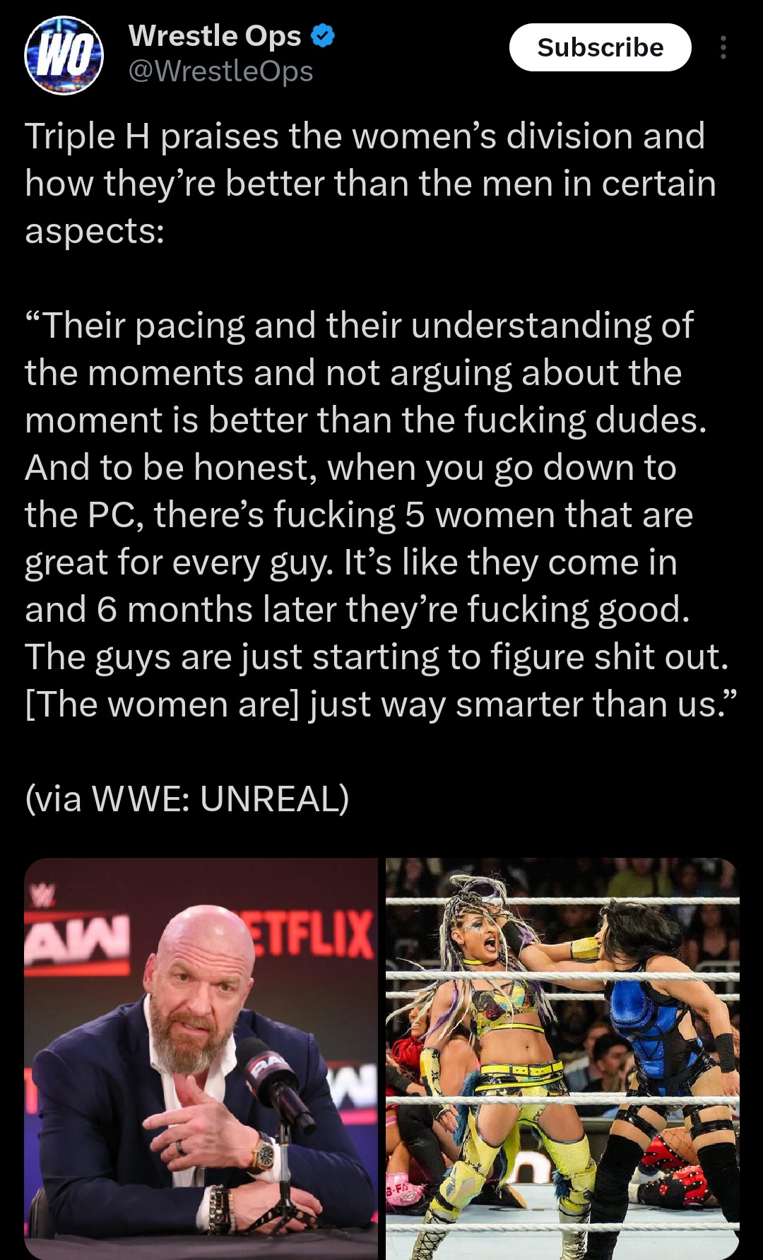 >>18397461Nah, you want the cold hard truth? The same reason women earn millions on Onlyfans is the same reason women are taking over every entertainment option. Music, streaming, wrestling, etc. everything. It's because MEN are the ones actually watching and they think with their dicks most of the time. If you take a Mark Briscoe or a Juice Robinson, Pac, Lio Rush, any of those guys and put it in a 8/10 hot women's body they'd be mainstream stars.