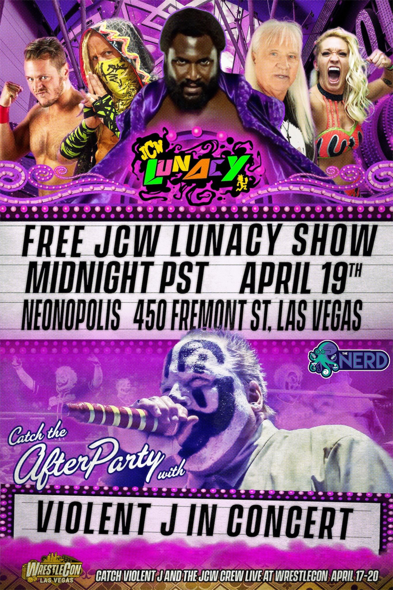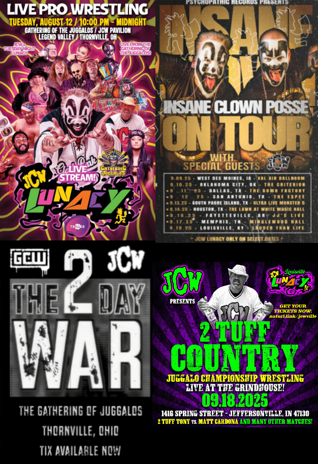 It's that time of year that you've been waiting for. The countdown to the Gathering of the motherfuckin Juggalos!>August 8, 2025: Horror Slam Raising Hell @ Special Taste Hall (Livonia, MI) >August 12, 2025: Live JCW Lunacy broadcast @ Legend Valley (Thornville, OH) live on YouTube and Triller TV >August 13, 2025: JCW tryouts @ Legend Valley (Thornville, OH) >August 14-15, 2025: GCW vs. JCW The 2 Day War @ Legend Valley (Thornville, OH) live on Triller TV >September 11, 2025: JCW Lunacy taping @ The Bomb Factory (Dallas, TX) >September 12, 2025: JCW Lunacy taping @ The Espee (San Antonio, TX) >September 13, 2025: JCW Lunacy taping @ Ultra Live Monster 5 Juggalo Island Show @ Clayton's Beach Bar & Event Center (South Padre Island, TX) >September 14, 2025: JCW Lunacy taping @ White Music Hall (Houston, TX) >September 16, 2025: JCW Lunacy taping @ JJ's Live (Fayetteville, AR) >September 17, 2025: JCW Lunacy taping @ Minglewood Hall (Memphis, TN) >September 18, 2025: JCW Lunacy taping @ Grindhouse Arena (Jeffersonville, IN) >October 31, 2025: Hallowicked @ Detroit Masonic Temple (Detroit, MI)