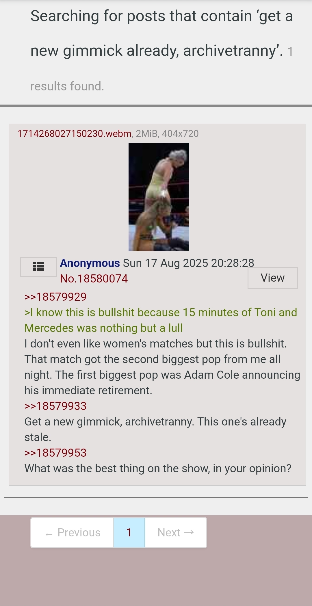 gAyEW fanboys wonder why nobody watches their show and nobody will ever take them seriously when it's gay flippy shit like this, overkill extreme stuff, and gay orange Cassidy shit on TV. No stars either, Shad Khan should cut Tony off financially so this shit can finally sink