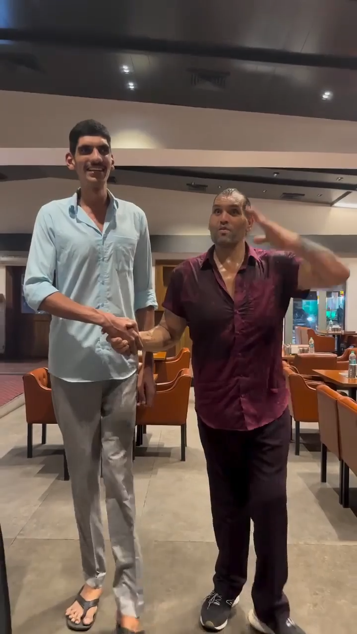 Khali at peak is billed at 7'1", Omos is billed at 7'3". Khali's probably shrunk a bit due to joint deterioration so we'll give him a good 6'11" for this picture. Omos would still be staring up at this dude, that's a crazy thought.