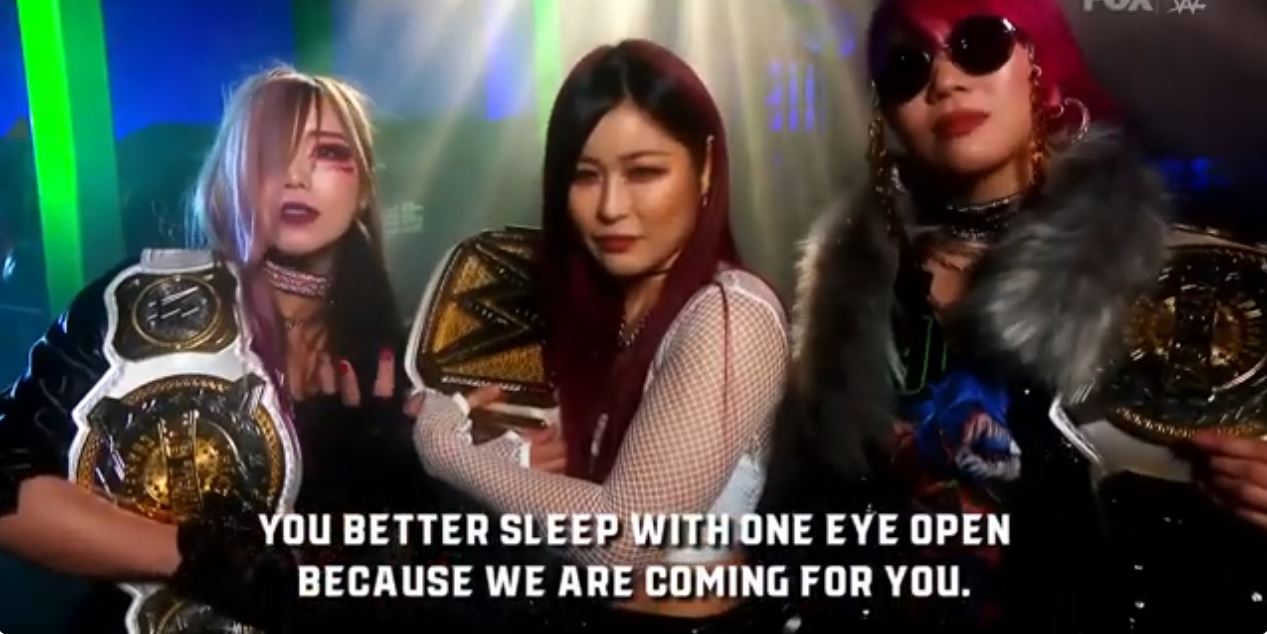 Asuka brought back the poison mist and used it on Rhea after their match. IYO came down for the save. Asuka then attacked IYO and forced Kairi to do the same!