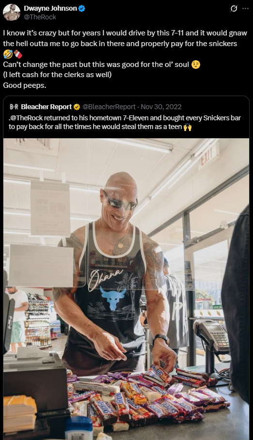 >>18985290I saw The Rock at a 7/11 store yesterday. I told him how cool it was to meet him in person, but I didn’t want to be a douche and bother him and ask him for photos or anything. He said, “Oh, like you’re doing now?” I was taken aback, and all I could say was “Huh?” but he kept cutting me off and going “huh? huh? huh?” and closing his hand shut in front of my face. I walked away and continued with my shopping, and I heard him chuckle as I walked off. When I came to pay for my stuff up front I saw him trying to walk out the doors with like fifteen snickers in his hands without paying.