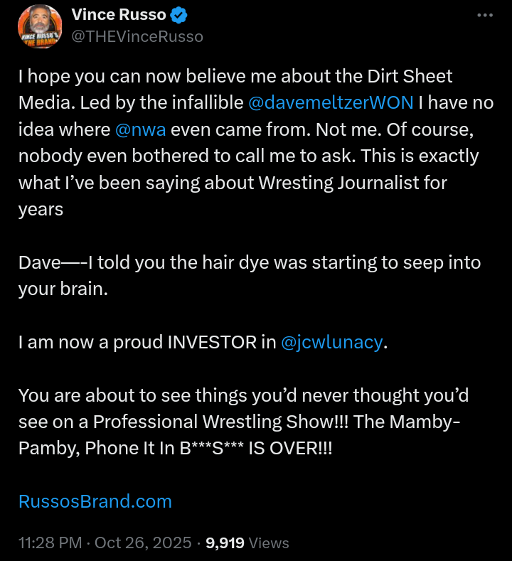 [47 / 6 / 1] 779KiB, 720x1146, Screenshot_20251027-023421~2.png View SameGoogleImgOpsiqdbSauceNAO Thread Reply Original Report Media View Same Google ImgOps iqdb SauceNAO Download Vince Russo in JCW Anonymous Mon 27 Oct 2025 07:36:12 No.19148339 View ViewReplyOriginalReport Quoted By: >>19148347 >>19148422 >>19148744 >>19149066 >>19149069 >>19149076 >>19149157 >>19149177 >>19149837 >>19149841 >>19149986 >>19151867 WHOOP WHOOP BRO!