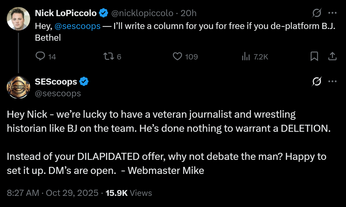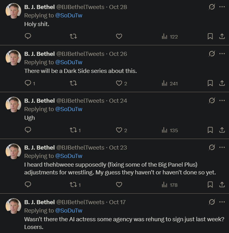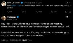 >>19167965>>19168546Nick is an agent for the company Punk, Liv and others are signed too. He might be a legit schizo and some anons have speculated he posts his own shit here. I think he works with Mike Tyson, but he seems to spend a lot of his time dunking on Dave and AEW fans on twitter who he accused of harassing him and his family. He posted a bunch of stuff as proof and it kinda looked schizo ramblings. He seems to know his Hollywood shit though. The other fag is the guy who claimed AEW was doing 500k on Max.