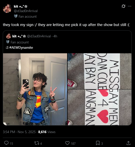 Some twink brought a "Gay Men 4 Hangman" sign and security confiscated. AEW is so fucking back!