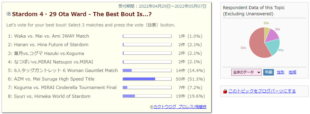 >6 Tag Gauntlet Match: Tam Nakano, Mina Shirakawa & Unagi Sayaka (COSMIC ANGELS) won against Giulia, Maika & Thekla (Donna Del Mondo) / Utami Hayashishita, Saya Kamitani & Lady C (Queen's Quest) / Ruaka, Starlight Kid & Momo Watanabe (Oedo Tai) / Mayu Iwatani, Saya Iida & Momo Kohgo (STARS) / Saki Kashima, Rina & Fukigen Death (Oedo Tai)