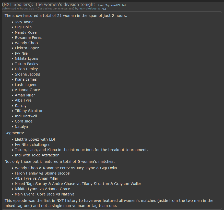 Interesting debuts in the women breakout tournament. The Tiffany/Waller vs Chase/Sarray stuff was absolutely delightful. KLR repackaging looks marvelous. Roxanne looks like a star. Building Indi back up to get a shot at Mandy Rose is perfect. Cora and Natalya putting it a great main event. Cora has so many moves, reversals and counters she is really incredible.