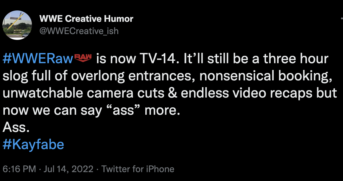 >>6411052How do you know it won't make it better? The new tv-14 Era hasn't even started. It's all just bitter cultists trying to establish and push a disingenuous narrative. We aren't stupid enough to forget how you all made it seem like the biggest selling point of AEW was being TV-14