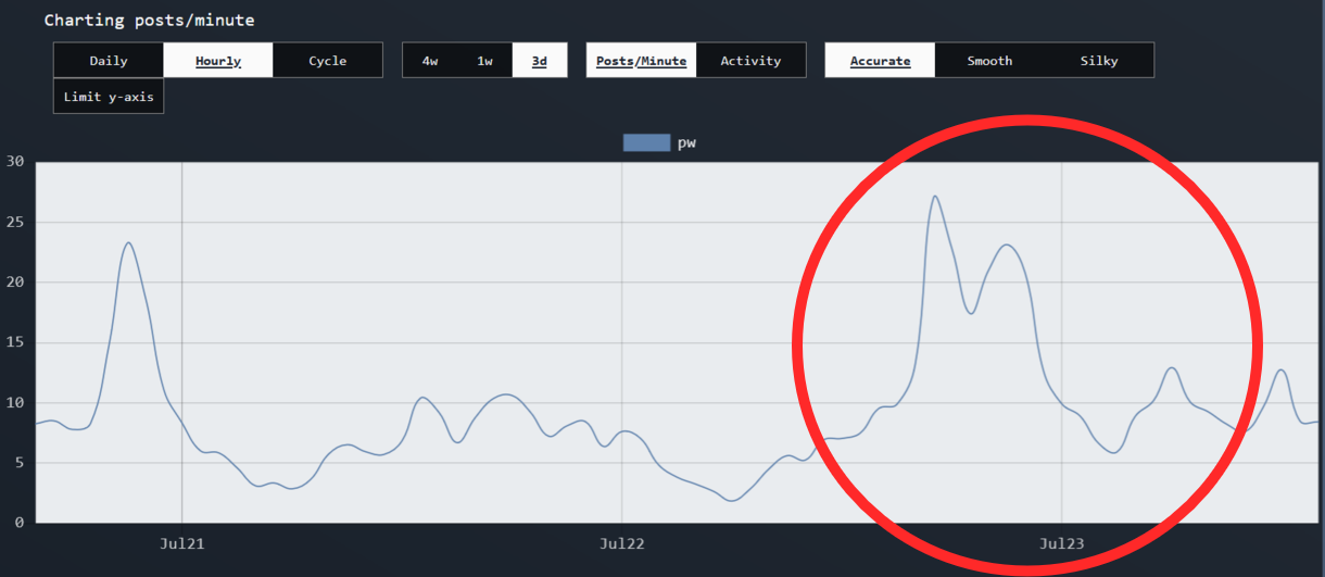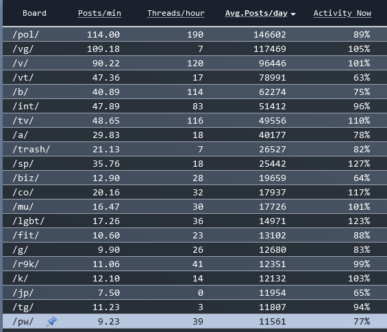 [12 / 3 / 11] 117KiB, 1220x531, pwplummet.png View SameGoogleImgOpsiqdbSauceNAO Thread Reply Original Report Media View Same Google ImgOps iqdb SauceNAO Download /pw/ FUCKING PLUMMETS Anonymous Sat 23 Jul 2022 19:30:40 No.6508652 View ViewReplyOriginalReport Quoted By: >>6508661 >>6508668 >>6508671 >>6508678 >>6508736 >>6508752 >>6508824 There has been a huge dip in posts per minute over the last 24 hours. On July 22, /pw/ sat well above 100% board activity, but as of this post, we are at 70% and dropping!KWAB
