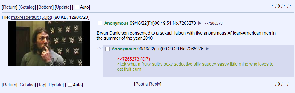 [5 / 2 / 1] 80KiB, 1280x720, maxresdefault (5).jpg View SameGoogleImgOpsiqdbSauceNAO Thread Reply Original Report Media View Same Google ImgOps iqdb SauceNAO Download Anonymous Fri 16 Sep 2022 04:19:51 No.7265273 View ViewReplyOriginalReport Quoted By: >>7265276 Bryan Danielson consented to a sexual liaison with five anonymous African-American men in the summer of the year 2010