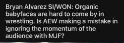 >>8015031No, Alvarez isn't correct, MJF should stay heel. There's a huge problem with modern day wrestling audiences where anytime a heel is really good at being a heel they start cheering them because of it. Not because they are 'cool' or a 'tweener' but because of some weird meta bullshit that usually consists of "He's really good at being a heel! I should cheer!". Even in ECW, with their smark audience, when Bubba Ray would go out, give a great promo and roast individual members of the crowd, he'd get the audience laughing but they'd immediately revert back to wanting to see him get his fat ass kicked as soon as the match started. I guarantee that if you replaced the smackdown crowd from when Vince gave that "life sucks" promo with an AEW crowd they'd be cheering him by the end of it and you'd probably even hear some "this is awesome" chants.
