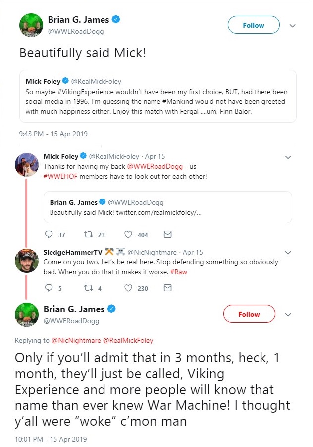 “Right after he put that tweet out, I got a call from Mark Carrano, or a text from Mark Carrano, and it lead to a call from both of those guys to make sure they were covering their tracks because Road Dogg basically said he was going to make sure that I would never have any advancement in the company. Legally, they're not allowed to do that because they're in power in a position in the office, and for him to say, 'I'm going to make sure that you're not going to move up and you can't advance your your money' legally he shouldn't be able to do that, so they were trying to cover their tracks.” “Then fast forward, and I'm sure we'll talk about this one day, RAW 25, I had to go in there and make sure that all of Shawn and his friends looked like a million bucks. We got to the back and Road Dogg passed right by me. He didn't say thank you after we bumped around for him. The only person that said thank you was Sean Waltman. So as a wrestler, I respect everything he's done for the business and I respect the path he's paved for us. As a person, I don't know how much respect I have for him.