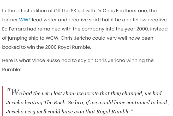 As a Oldfag, I do love the revisionist history that the smaller, "missed-used" guys who jumped ship (Jericho, Benoit, Saturn, Malenko) were treated better. Benoit was the only one that I'd say was a upper-card guy. Wrestled (and lost) to Triple H in his first WWE match, beat The Rock (due to shenanigans) on an episode of RAW, won the Intercontinental title 3x, main-evented two PPVs (Fully Loaded and Unforgiven) both with falseflags of him winning the WWE title.