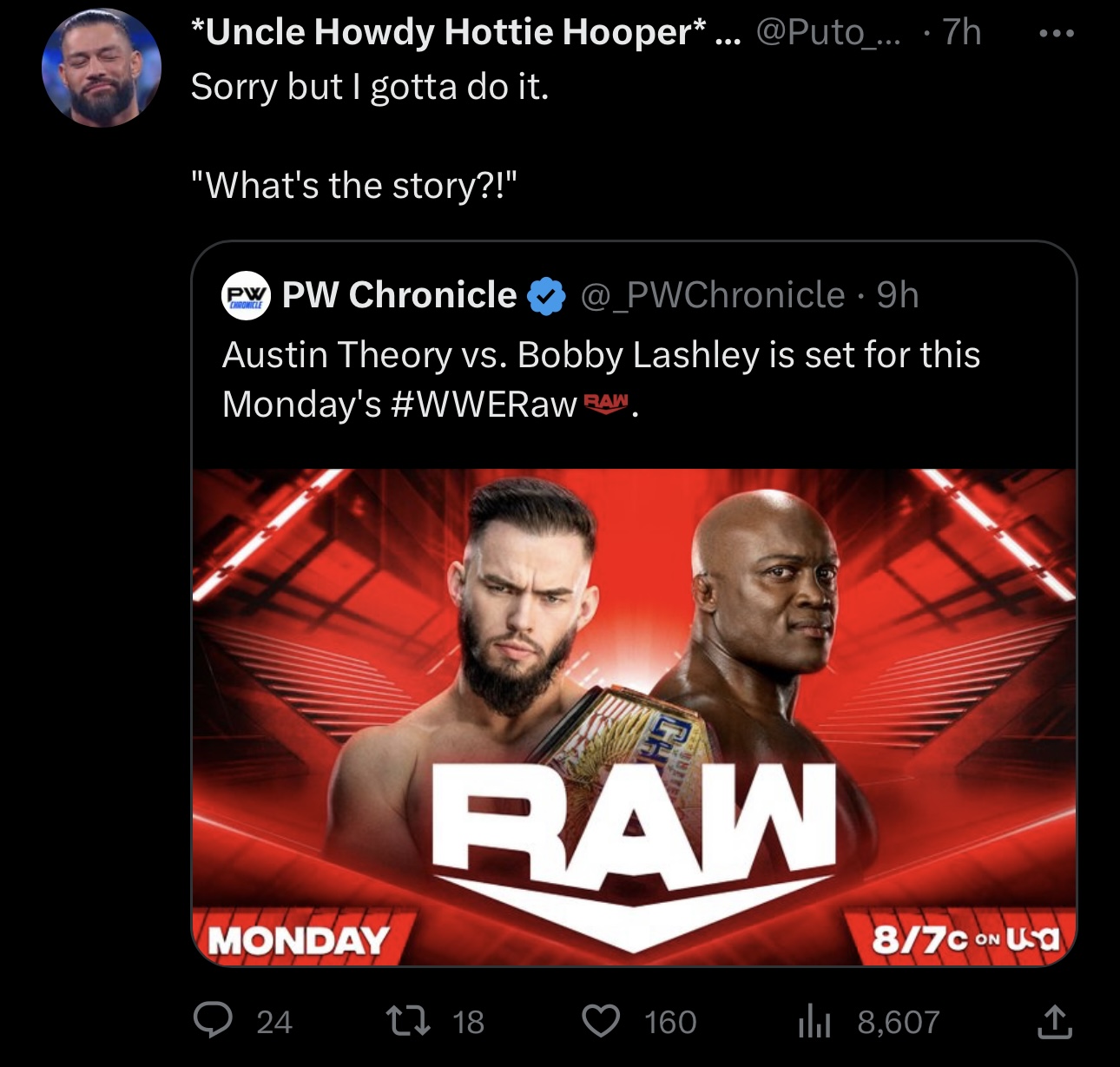 Austin Theory and Bobby Lashley go head to head in a title match for the UNITED STATES Championship. While Theory gets some offense in early, it quickly becomes one sided with Bobby getting the upperhand. In a matter of moments we see Lashley hit Theory with a devastating Spear. Lashley drags Theory's body to the center of the ring and picks him up for the Hurt Lock. Just then, the lights dim and a video appears on the tron. ITS UNCLE HOWDY. This distracts Lashley giving Theory an opening to hit his A-Town Down for the 3 count. The purpose of this match is to restart the Wyatt story line where it left off.