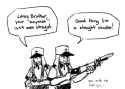 "What's that?" The one on the left shifts, suspicious.