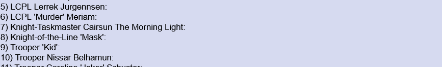 Forgotten QM !!cRQ2bB+8b3B ID:X+LIF3ti Tue 07 May 2024 10:05:22 No. 5996961 Report [2/2] <span class="mu-i">“Who? Who he says?!”</span> The minstrel covers his face dramatically, playing on the crowd’s attention. <span class="mu-i"> Mayaps you’ve heard of these ones then, sprout. Sir Jason Fallavon, before he became Lord Fallavon the Fair following the death of his brother, Sir Heinrich Hightower of the Pegasus Order and of course Sir Ayan the Moor to name but a few. Who else am I leaving out?”</span> <span class="mu-i">“The Black Knight…”</span> A member of the audience grumbles darkly from the back of the room. <span class="mu-i">“Best not leave that one and his ilk out.”</span> The bard pauses, his face turning serious. <span class="mu-i">“Aye. We must take the bad with the good. But even good can come from men of ill-repute. And, as they say, every dog will have his day…”</span> =================================== POV Verification Vote: Open for 24 hoursIf your ID changes during this thread, please link back to your OG vote here or your new ID votes might not be counted. >Young Lord Damien Andrei, elder brother and heir to House Andrei >Sir Robert Gilbern, the calculating Second Herald of the Ordo Reginate >Sir Karlaus Rabe, the gruff Montbrun companion >Sir Neil dan Marc, the loyal Sworn Man from Fallavon >Tracker Jean, the Business Partner from the Wastelands >Sir Willem Glasdale, the friendly protector of Grenmire >Young Lady Frida Vancewell, the cunning viper of Montbrun >Father Towbray, the zealous priest of the Angelite Sect