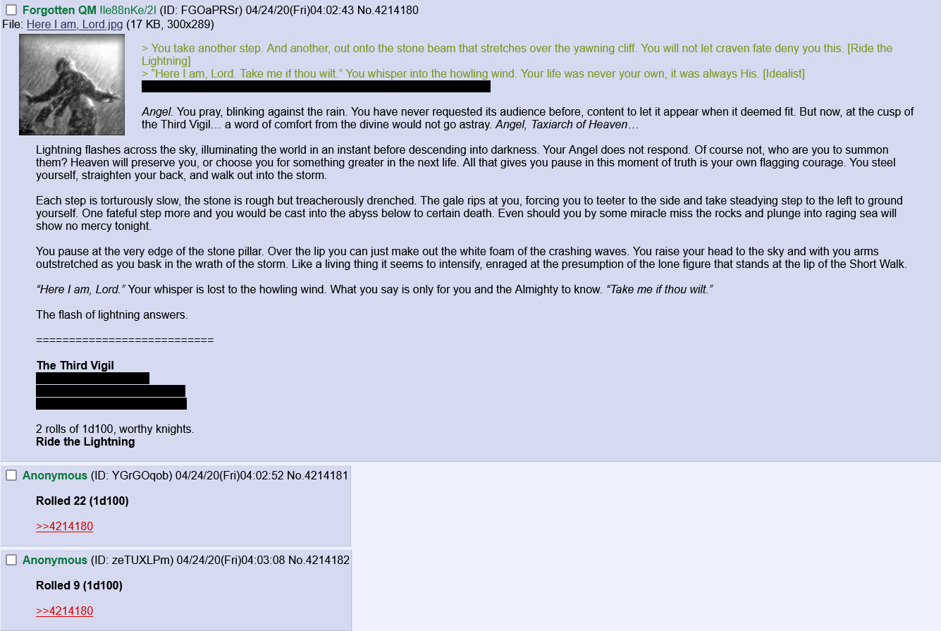 Forgotten QM !!cRQ2bB+8b3B ID:X+LIF3ti Wed 08 May 2024 10:35:06 No. 5998045 Report [2/2] Doubt was now a foreign realm to Towbray. More foreign to him than Cathagi was to Canton, perhaps more so. As removed and irrelevant to him as the Sister moons were to earthly empires. Father Towbray knew that he could no sooner abandon this cause than he could cut off his own arm. No sooner could he falter but one step on the long and perilous path that lay ahead than pluck out his own eyes. There was no act of sacrifice this wiry priest would not glady make, no hardship he would not endure with a smile, if his own meaningless privations advanced this sacred convent the barest fraction further. And now, joyous day, he was not the only one. Father Towbray. Brother Joab, Brother Caleb and Brother Pettigrew to name but a few of the score of souls that had followed him on this endeavour. To spread the word and ready the realm for the return of the people’s anointed saviour, Sir Emile Andrei. They were not of noble stock, these first Angelites. Cobblers, tradesmen and serfs that had, each man among them, found a higher calling after their pilgrimage. It was a humble beginning, for certs. But that was as it should be, as it had been near a millenia ago when the founders of the Kingdom of Canton set out to change the world. Almighty be praised, the blessed task lay with the to do all they could to ready the realm for the Living Saints return. It was Father Towbray’s solemn duty to direct their efforts to where the seeds of their good word and good works would yield the greatest harvest. ========================> There are those that never gave up the fight. The Order of the Broken Blade, the Reclaimaint Sect and other Cain-aligned orders. These widespread and diverse Cainites must hear of the coming crusade first, and know in their hearts that the words ‘someday’ in this great undertaking are now ‘soon’. With the true and ready believers first to answer the call, the recruitment and marshalling of the most fervent forces can begin. [Zealous] > There can be no greater ally to the Living Saint than the Church itself, and potentially no greater obstacle. The Bishops of all five Duchies have dragged their feet long enough with the formal recognition of Emile’s recorded miracle, now miracles. The priests of the realms must be persuaded, their superiors pressured until the administrative impediments and hand wringing are removed for the miracles to be officially declared. From there, in time, a convocation to anoint the Living Saint interregnum. [Zealous] > The task of Heaven is not to sway the mighty or appeal to the strong, it is far simpler than that. The good word must be spread, the people of birth both high and low must be told as far and as widely as possible. Romaine is the birthplace of the Living Saint, and where his crusade will inevitably be launched. The Angelites will scatter to each corner of Canton, but this priest goes there to set the first stone upon the first shrine. If you build it, they will come. [Zealous]