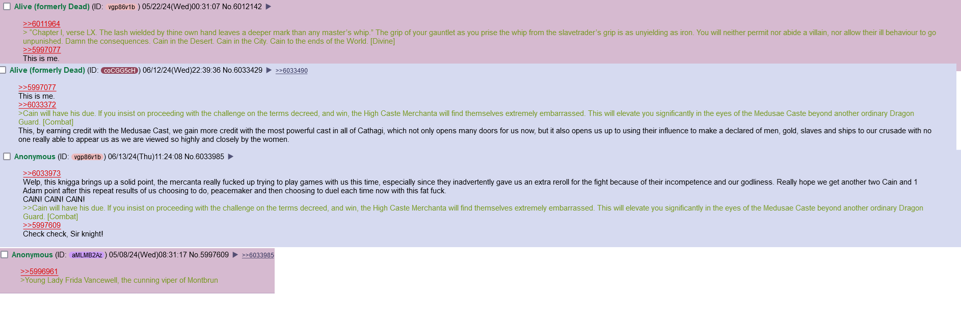 >>6033372 >>Cain will have his due. If you insist on proceeding with the challenge on the terms decreed, and win, the High Caste Merchanta will find themselves extremely embarrassed. This will elevate you significantly in the eyes of the Medusae Caste beyond another ordinary Dragon Guard. [Combat] And on this day, the Lord said “Let no Fucking copperclip live uncut!”