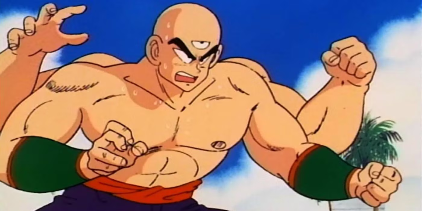 Faster than he can react, Krillin closes in on him as well, tearing the weapon from his grip and snapping it like a twig in his hand. But then, instead of knocking this guy out, reaches over, placing his right hand on his forehead.