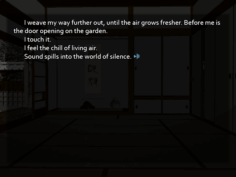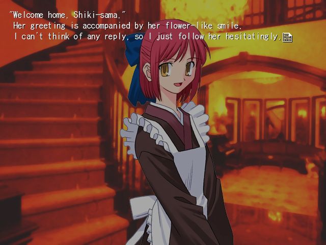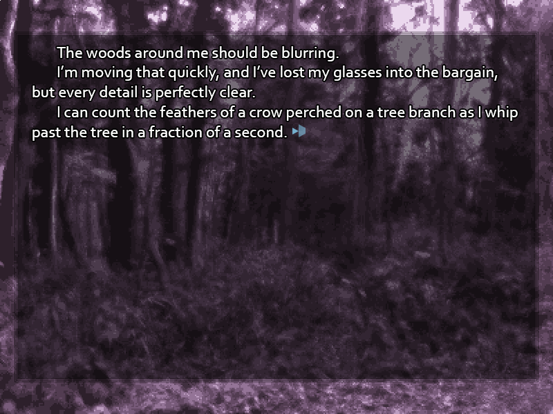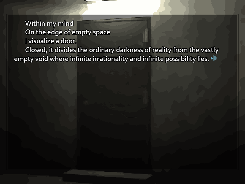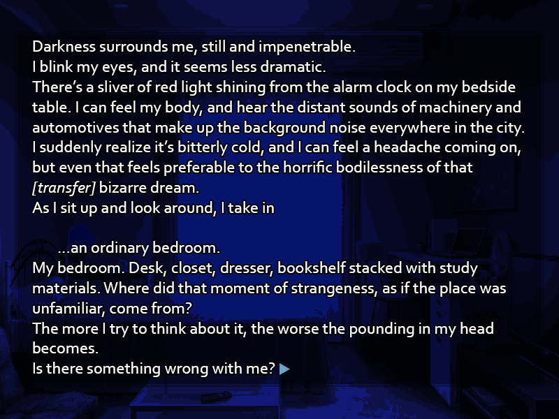 <span class="mu-s">February 4 -Contemplation-</span> Darkness surrounds you, still and impenetrable. You blink your eyes, and it seems less dramatic. There's a sliver of red light shining from the alarm clock at your bedside table. You can feel your body, and hear the distant sounds of machinery and automotives that make up the background hum of the city. It's bitterly cold, you realize, and you can feel a headache coming on, but even that seems preferable to the horrific bodilessness of that <span class="mu-i">(transfer)</span> bizarre dream. As you sit up and look around, you take in... an ordinary bedroom. Your bedroom. Desk, closet, dresser, bookshelf stacked with study materials. Where did that moment of strangeness, as if the place is unfamiliar, come from? The more you try to think about it the worse the pounding in your head becomes. Is there something wrong with you? You roll out of bed, get to your feet in a discombobulated stagger, and feeling strangely out of place in your own body, stumble to the bathroom. In the fluorescents, the face that greets you from the mirror looks horrendous. Beads of cold sweat stand out on your forehead, your eyes bloodshot and staring. Unmistakably, though, it is <span class="mu-i">your</span> face. Black hair. Black eyes. Fine, scholarly features. Clear skin, tending toward the fair. It's the face that, with some changes as you've grown, you've been looking at in the mirror every day for eighteen years. It looks as if it doesn't belong. You've never had any complaints about your looks before, but now somehow this face looks pathetically shoddy and slapdash. The face you should have is quite different, isn't it? The face you were wearing just moments before, when the world melted, that face wasn't like this at all. You reach up, grab your own cheek, and feel the pinch. See skin compress between your fingers. This is at least no dream. That hand in the mirror is the next thing to catch your attention. Just like the rest of you, your left hand looks wrong. It itches terribly. Without a thought you find yourself scratching the back of your hand with a vicious force, sinking your nails into it so hard you almost draw blood as you scrape cruel red welts across the skin. The pain is a momentary distraction, but it does nothing for the itching, which you now find spreading across your entire body. On the skin, under your skin, into your bones, racing through your nerves and down your blood vessels. Everything is wrong. The air in this bathroom is as heavy as water around a submarine, suffocating you with pressure.