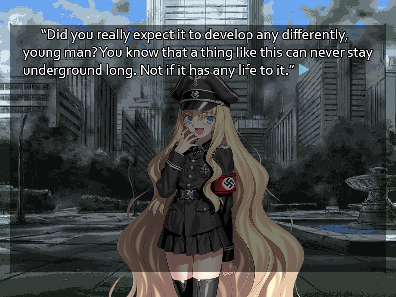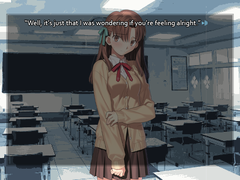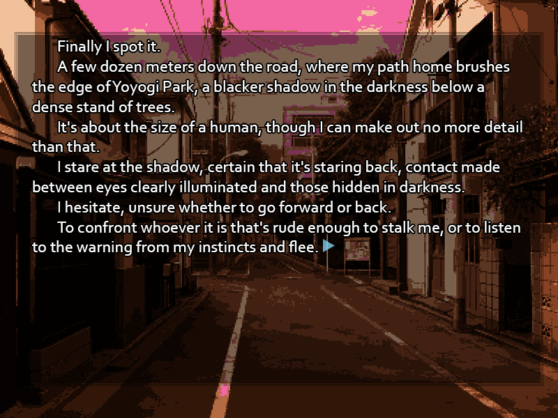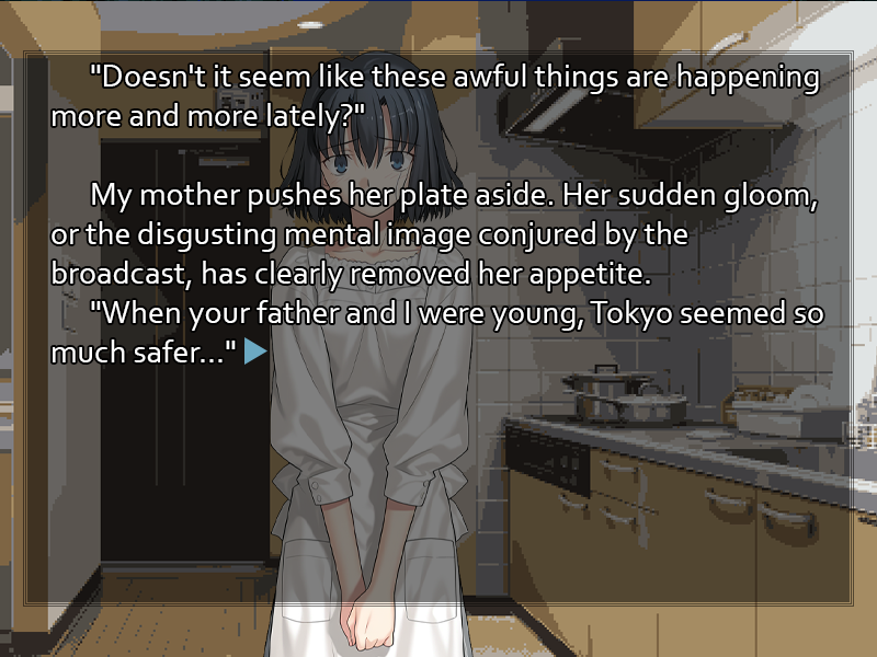 Sweets-Loving QM !!m9IjZ66S7uQ ID:ZHb4YujP Sat 14 Jun 2025 01:23:25 No. 6257882 Report The man's voice dwindles as Yumigawa Setsuna thumbs the TV remote's volume button, her fine brows drawn together in distaste. Obviously unnerved by the gore accompanying the vandalism, the prospect of Tokyo's infiltration by foreign elements is a step too far for her to go on listening. You recall an expression from the previous night's strange dream, the open smile of someone genuinely happy just to share a meal with good company. There's no such feeling to be seen in your mother's morose face. Is it your imagination that tears seem ready to well up in those downcast eyes? "Doesn't it seem like these awful things are happening more and more lately?" asks your mother, pushing her plate aside. Her sudden gloom, or the disgusting mental image conjured by the broadcast, has clearly removed her appetite. "When your father and I were young, Tokyo seemed so much safer..." It isn't a comment that requires a response. The woman is glumly seeking refuge in memory, staring into the middle distance rather than looking at either you or the television. You expect she'll dwell on this for some time, but it's hardly your concern. Her fragile moods never prevent her from dealing with the housework, and just as she has her routine as a housewife to attend to, you have your duties as a student. As you rise to go, however, a sudden flash of renewed pain in your head reminds you again of the night's oddities. It may be difficult to perform to your usual standards of scholarship with your head throbbing this way. >[ ] Set off for Kyoutenkan High, your school. You arrive early every day, with student council business to attend to, and today should be no exception. >[ ] Stop at a convenience store on your way to school and pick up some pain medicine. Even if it isn't as bad as it was when you first woke up, this headache is a problem. >[ ] Go upstairs to your bedroom and look around for anything unusual, any traces of your strange, hazy experience last night. >[ ] Ask your mother if she's feeling alright. Even if she has always been prone to moods, such a reaction to the news is strange. >[ ] Write in