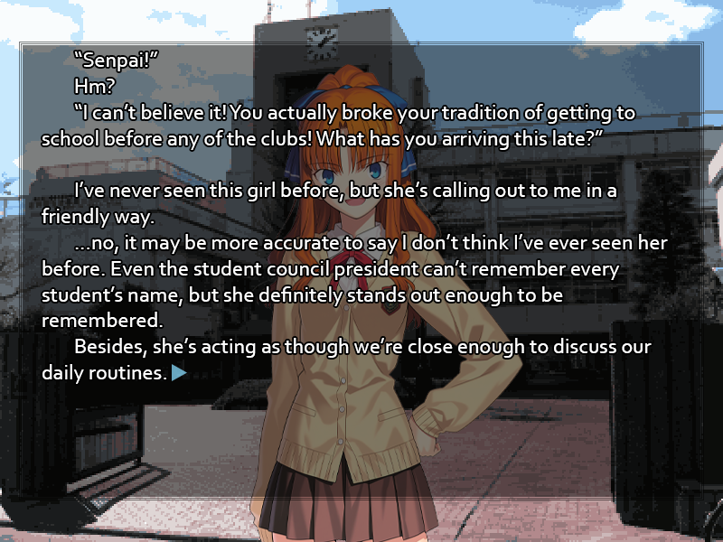 Sweets-Loving QM !!m9IjZ66S7uQ ID:ZHb4YujP Sat 14 Jun 2025 22:56:13 No. 6258342 Report There's no friend close enough to discuss your unusually late arrival, notice your unusually pale complexion, or inquire after your health; aloof from the masses as a politician should be, you move among your fellow students as one of their betters, with them but not of them. It is the same social dynamic you'll live as an adult, and well-practiced from youth. Already your mind is turning to your studies, and to the daily duties of the student council, whether there will be notes to review on any morning business that may have been conducted before you arrived, when- "Senpai!" Hm? You refocus on your surroundings, roused from your thoughts by an unfamiliar voice seemingly directed at you. "I can't believe it! You actually broke your tradition of getting to school before any of the clubs! What has you arriving this late?" Stepping out of the crowd is a red-haired girl, a first or second-year by her looks, and putting herself between you and the entrance to the school building. You've never seen the girl before, but she's calling out to you in quite a friendly way. ...no, on second thought it may be more accurate to say you don't think you've ever seen her before. Even the student council president can't remember every student's name and face, but with her foreign looks this girl certainly stands out enough to be remembered, if you've been introduced. Besides, she's acting as though you're close enough to discuss your daily routines. For a moment you think of the strange shift in your concerns from yesterday to this morning, and the stranger dream from last night that seemed so vivid. Could something have happened to your memories?>[ ] Pretend to recognize the unfamiliar girl, as if there's nothing strange about her greeting you and asking about your routine. Hide the abnormality in your memories. >[ ] Ask the girl if you've met before, and why she's taking an interest in your late arrival. >[ ] Ignore the strange girl and brush past her. You're confident in the integrity of your memories, making her the one behaving strangely. You can find out who she is from your colleagues in the student council, later. >[ ] React in some other way. (Write in)